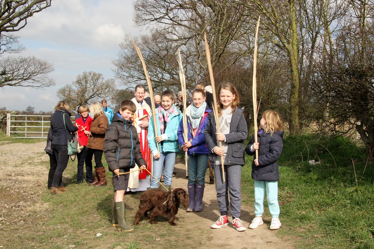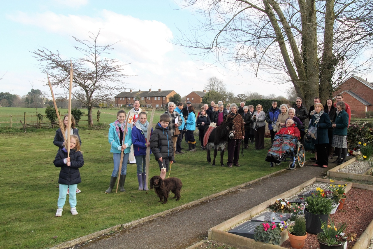 The event began with prayers said by the Rector, Rev Malcolm Cowan at Peral Lane, and followed the Littleton footpath through to Christleton, stopping for prayers and bible readings at set positions on route. The weather was glorious with signs of spring in the hedgerows and all around. As the procession reached the churchyard, parishioners came out to watch, collected their palms from Lucius’ saddle bags, and after final prayers were said, and saying farewell to Lucius, the congregation entered church for the traditional Holy Communion Service.