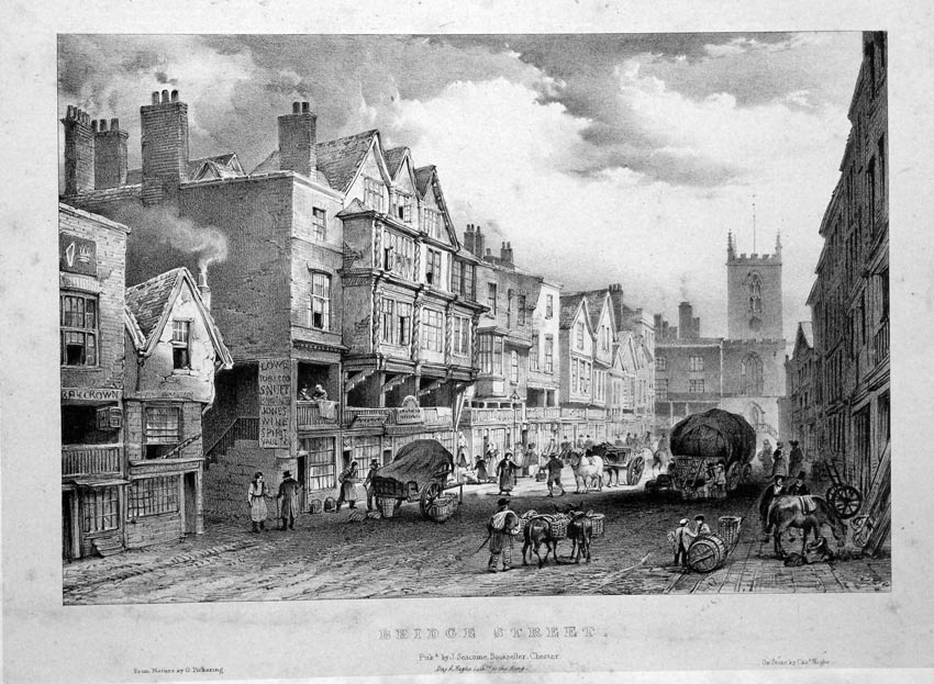Lower Bridge Street, looking Down. Lithograph drawn by W. Tasker and published by John Seacombe, Bookseller, Chester circa 1840