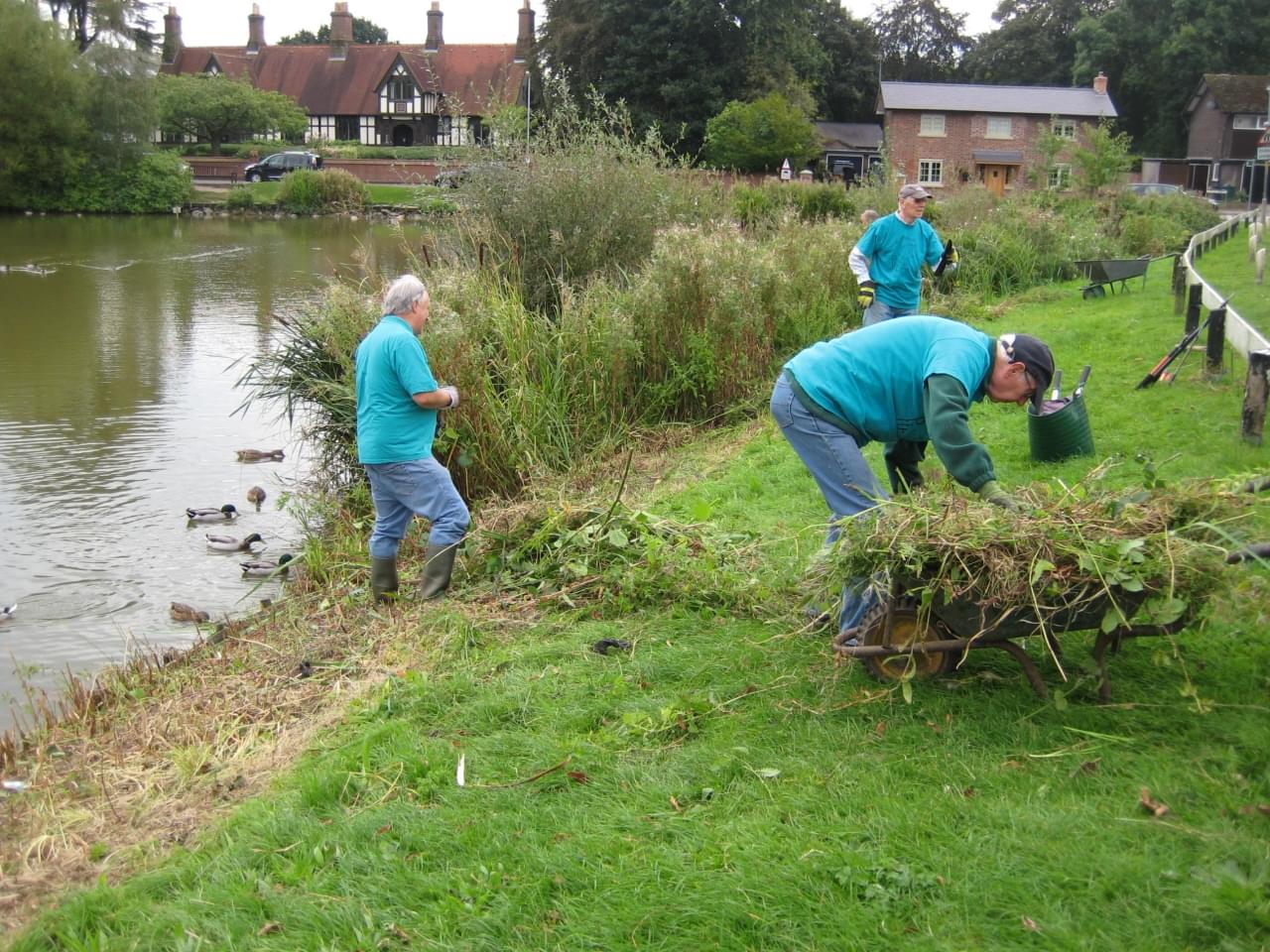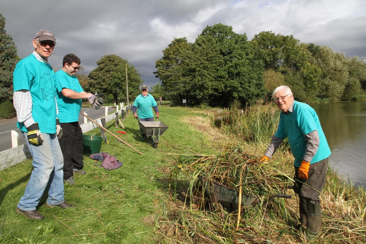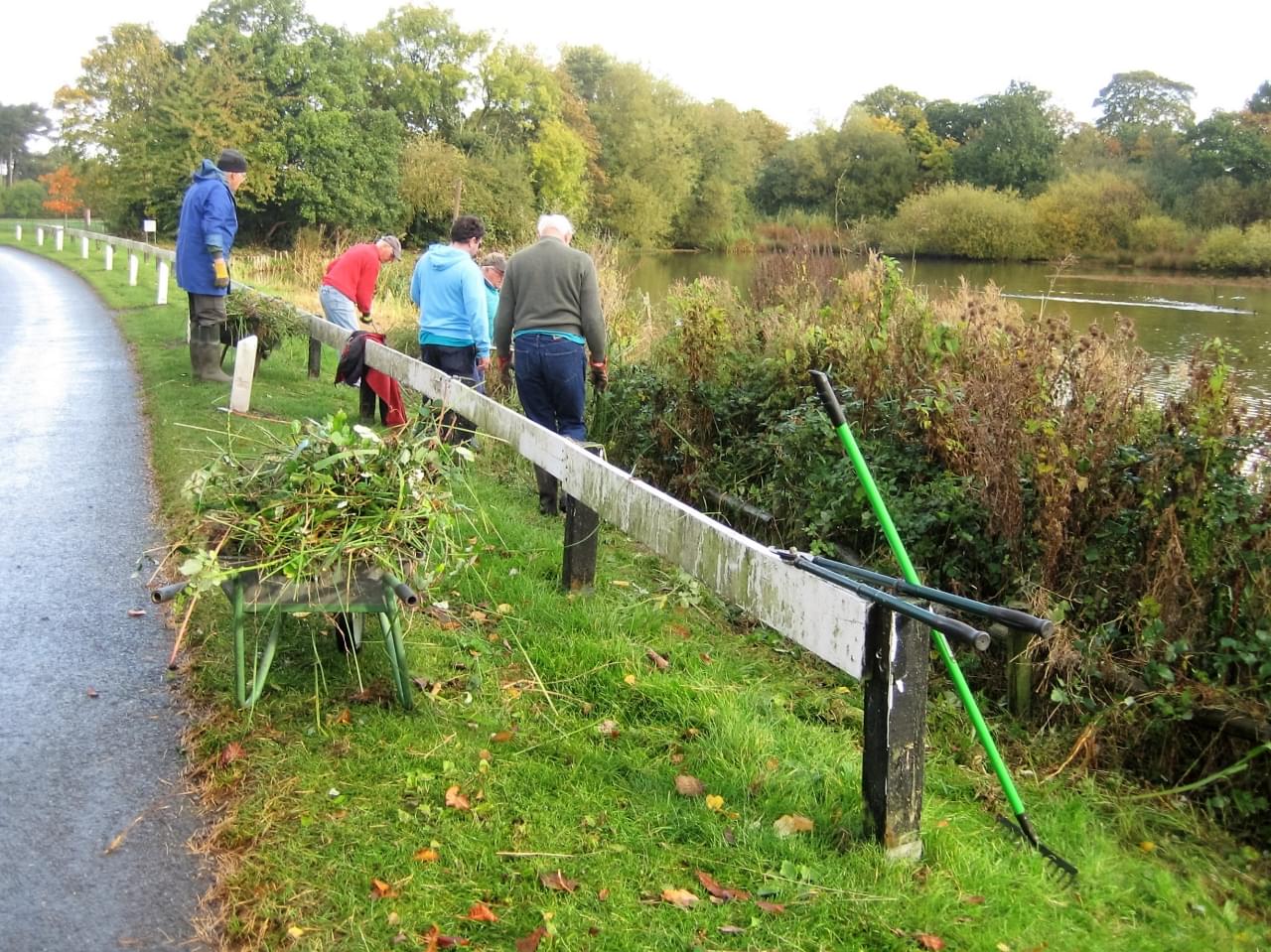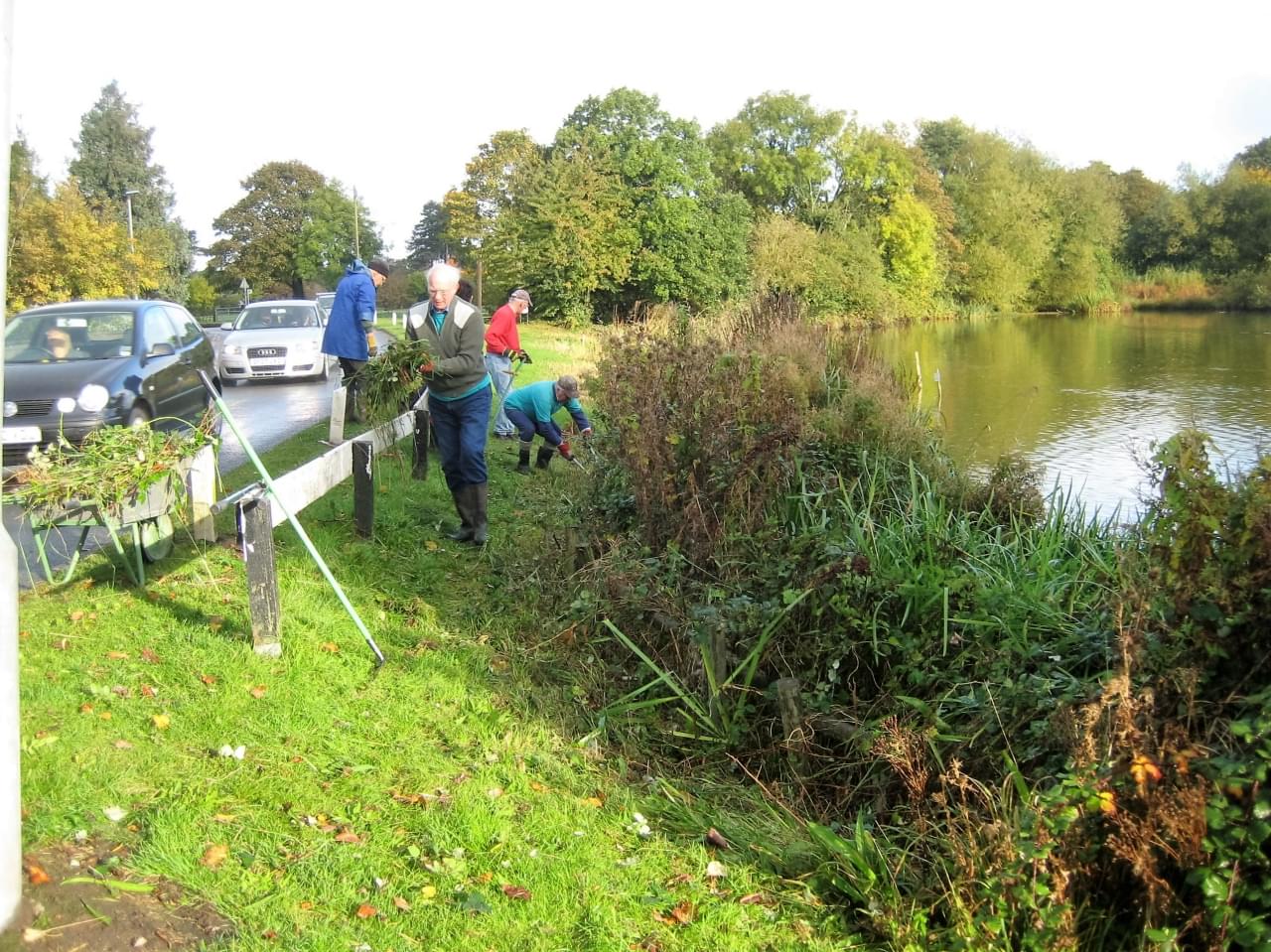 The first phase of the work planned for autumn has been completed, and the bank and fishing area on the Littleton side cleared ready for the installation of the new coir rolls and fishing platform. Five sessions were held, and a new skill of scything learned by several members. David Booth & Malcolm Pratt were both extremely adept at using the scythes, and a huge quantity of vegetation was removed. Several large willows were cut right back and many smaller ones removed completely. It seems that the roots of the willows have become embedded in the older bank of coir rolls and have spread through them, often emerging alongside the supporting posts. We have drilled several of the thicker trunks, and tried to suppress their growth with” deep root”