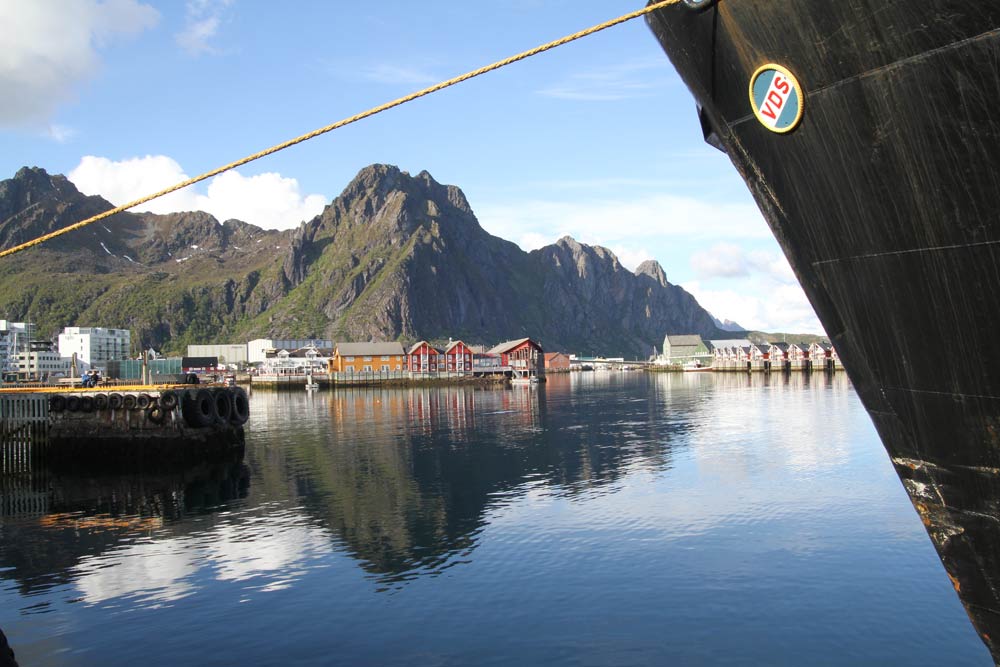Fish were thrown into the fjord in front of the boat, and with their huge talons fully extended, the eagles swept down into the water picking up the fish in one splashing movement, before heading off to eat it in the lofty heights of this magnificent landscape. During the next hour we saw another six pairs at least of these superb creatures, as they circled around on thermals high above us. They continued to circle as we progressed through the fjord, and would after giving a loud scream, plummet into the deep waters ahead of us, and attempt to catch yet another unsuspecting fish. It was a really memorable occasion, and we were able to share this superb experience with new friends, and in the first bright summer sunshine that we had experienced on our 12 day journey. Our fishing boat then sailed on towards the delightful fishing port of Svolvaer in Lofoten, to enable us to meet our tour ship “M.S. Lofoten” the oldest and pride of the present” Hurtigruten fleet”. Here, in the magnificent setting of this historic town surrounded by high snow covered mountains, and a calm sea, we experienced the midnight sun in all its glory, walking around the streets at 11.00pm as if it was mid-day on a warm summers day in Chester.