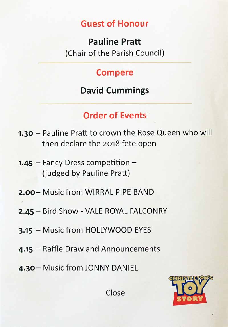 Following the Crowning of the Rose Queen by Cllr. Pauline Pratt Chairman of Christleton Parish Council, Jessica made an excellent opening speech thanking the Fete Committee led by Dawn Sturgess for organising the fete and all their hard work, the Headteacher Oliver Mitchell & Governors of the Primary School for the use of the field, stall holders and everyone present for their support.