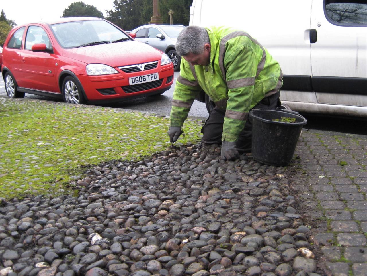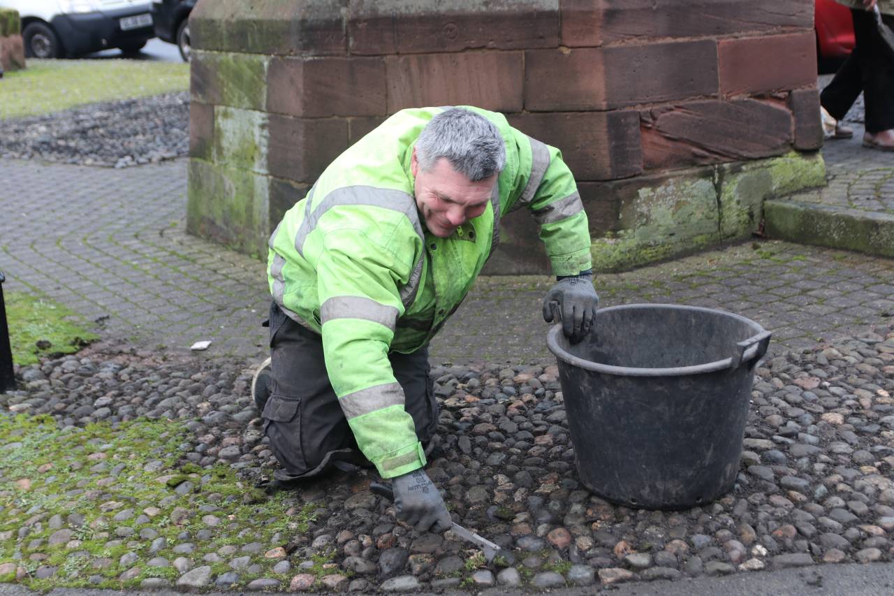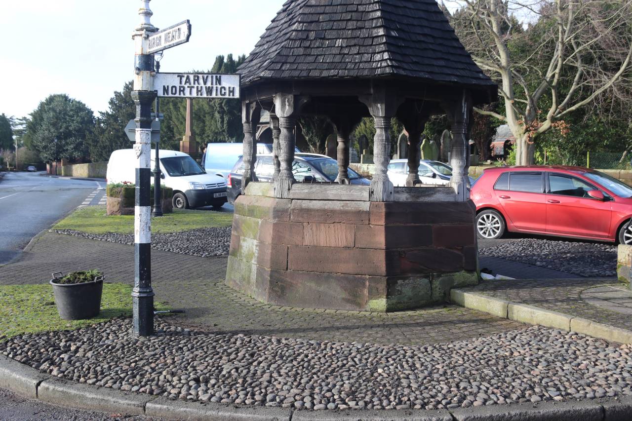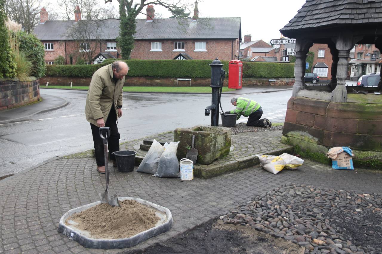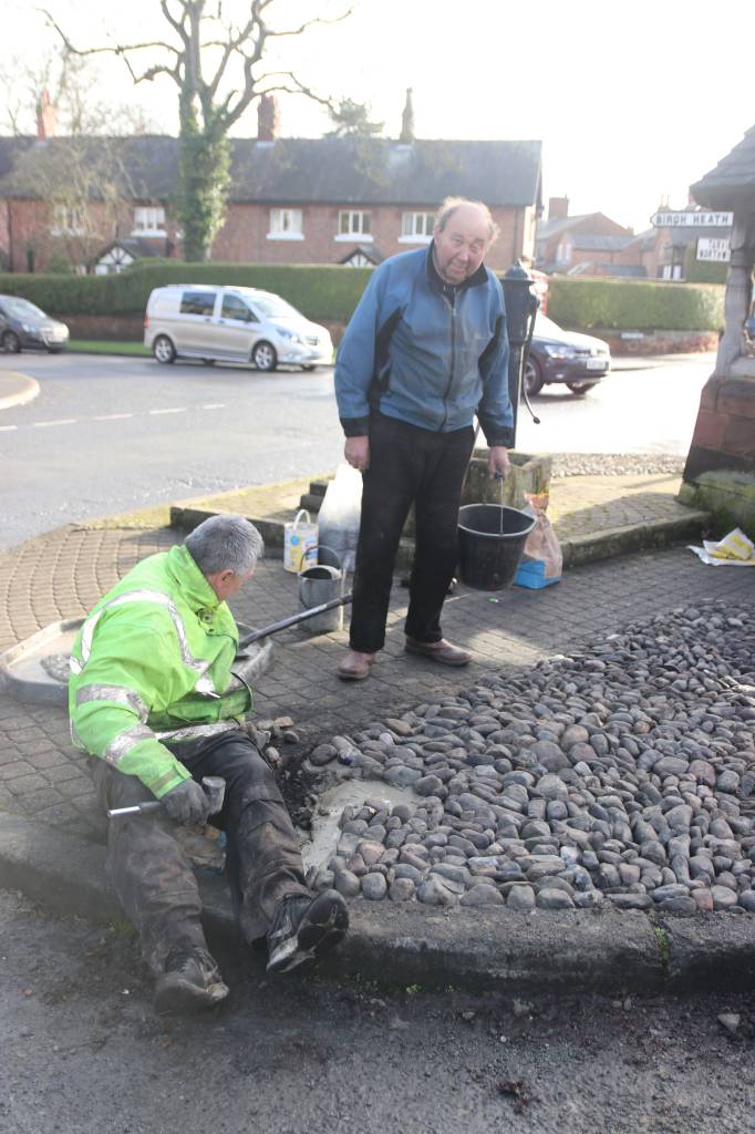 A cobble is sometimes described as larger than a pebble and smaller than a boulder, and formed from volcanic rock. They are very hard and durable. Large areas of the village were once covered in cobbles, and old village photographs show them along Pepper Street, Village Road, Littleton Lane, Rowton Bridge Road and Plough Lane as well as on backyards and village farmyards. It looks as though the cobbles on village roads were still on the ground in the 1930’s, but I don’t have evidence to show when they were removed. It is clear that in some places, Pepper Street for example, the current tarmac surface was placed on top of the cobbles, as a small section was exposed recently on the approach to Trooper Bridge. Older residents will possibly remember that the cobbles currently being restored were originally laid in front of the Lych Gate, but were removed perhaps twenty years ago as a health & safety issue, and relayed as a decorative feature around the Pump House.