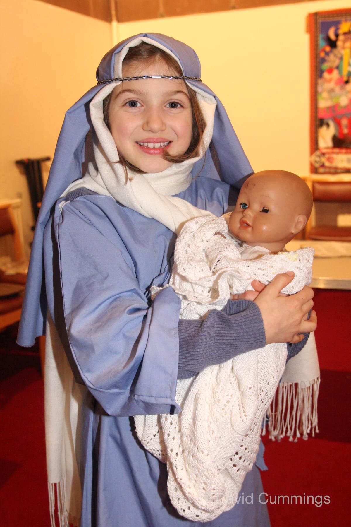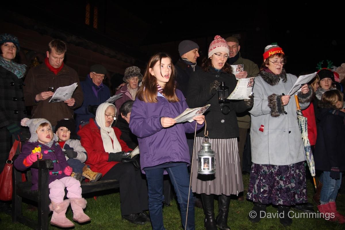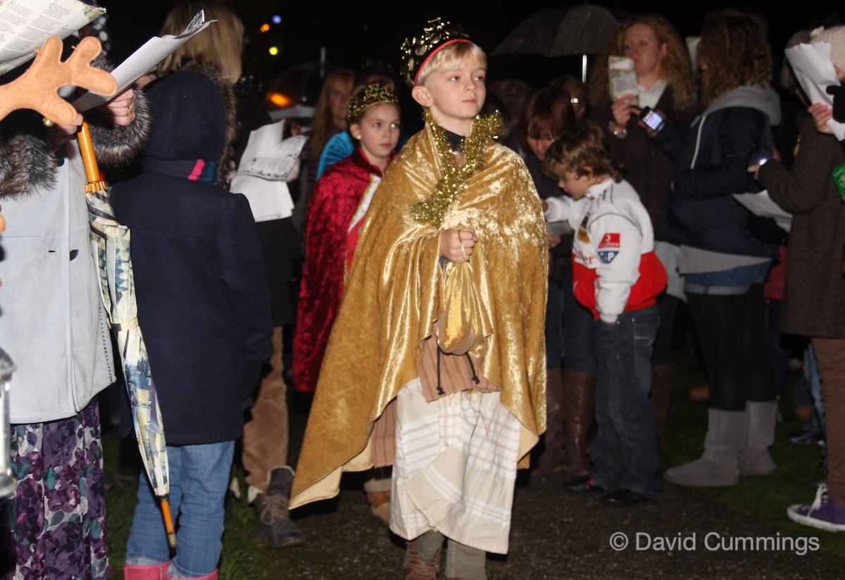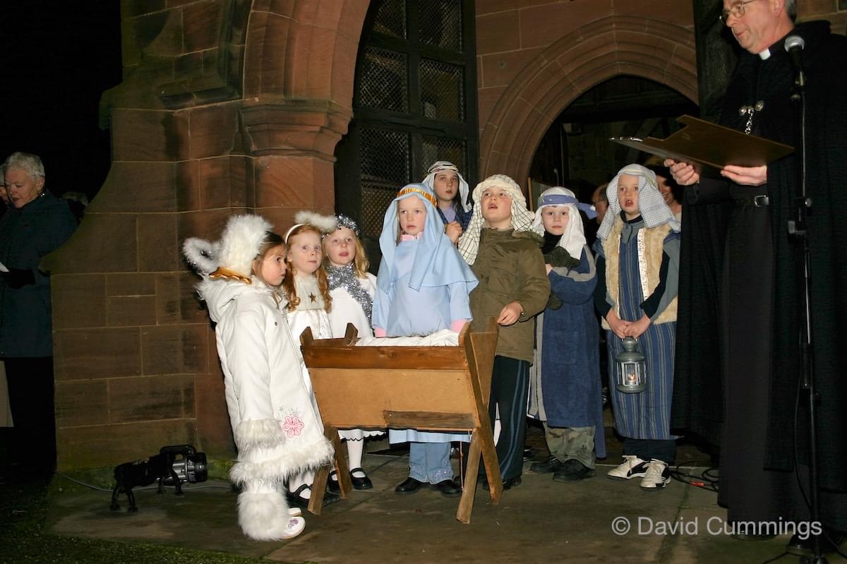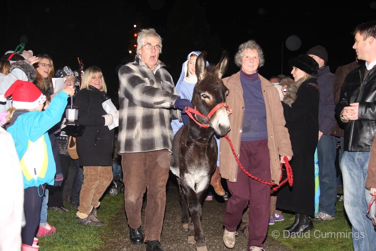 Christleton has always been a village for celebrations and I have featured many of them in the past on our website. This month I want to highlight some of my favourite occasions, especially ones around Christmas that I managed to capture with my camera. One of the occasions I remember most was when it was snowing hard and I wanted to see how dramatic it was in the village. So I decided to drive from Rowton along Brown Heath Road and Plough Lane, through the snow to the village, actually following the snow plough. It really was a very rare sight to see a snow plough in the village, and I managed to capture it in action, coming past the Ring O Bells and the Village Green, images I managed to capture with (old fashioned) slide film. The Village Green tree was lit up as usual, and in the background you can see the beautifully illuminated church tree, and the superb cross high up on the tower. These images set the scene for the accompanying pictures of the procession of children arriving at the church porch, to tell the story of the Nativity. On several occasions the youngest children from the Sunday School, were led by our good friends, Douglas and Muriel Cashin, and their donkey Lucius. These were always wonderful occasions with hundreds of people taking part, often carrying glass jam jars with lighted candles, well before the advent of the modern battery torches and lanterns.