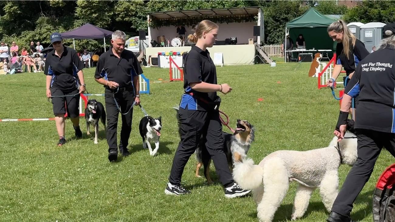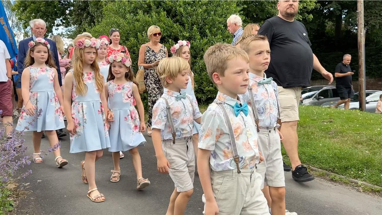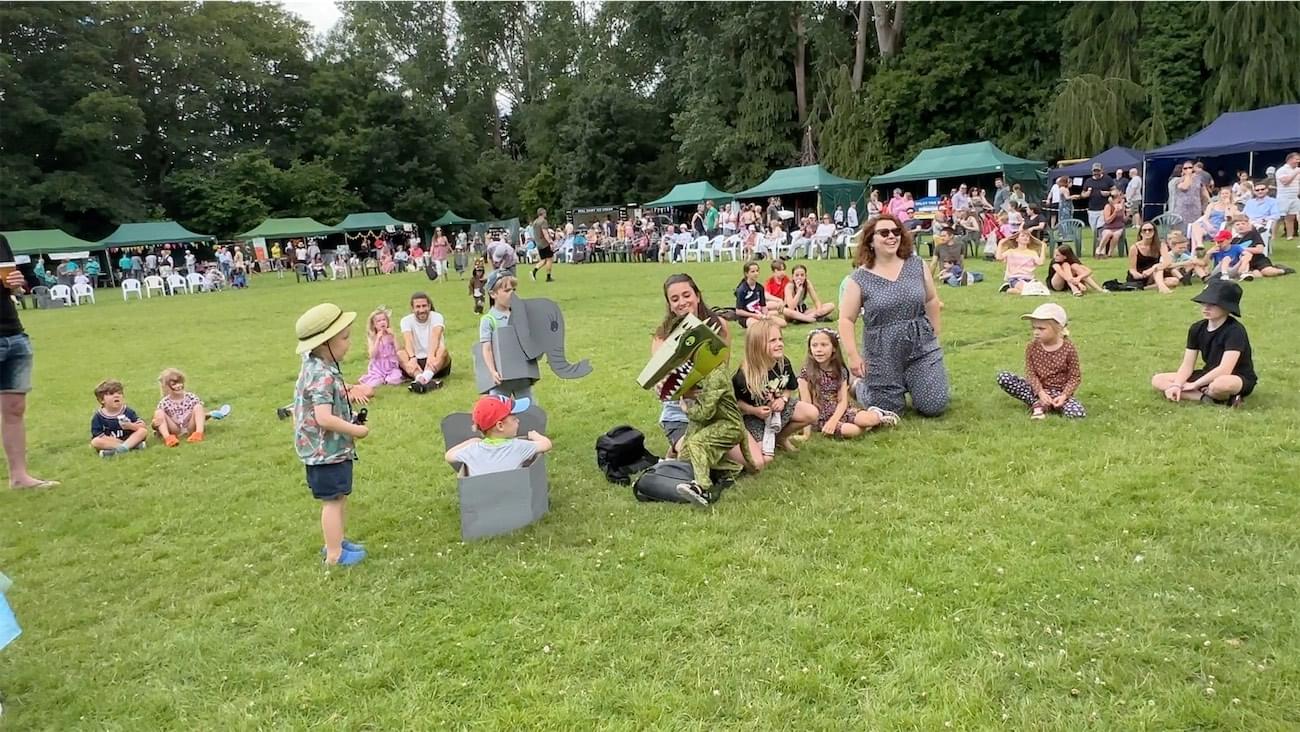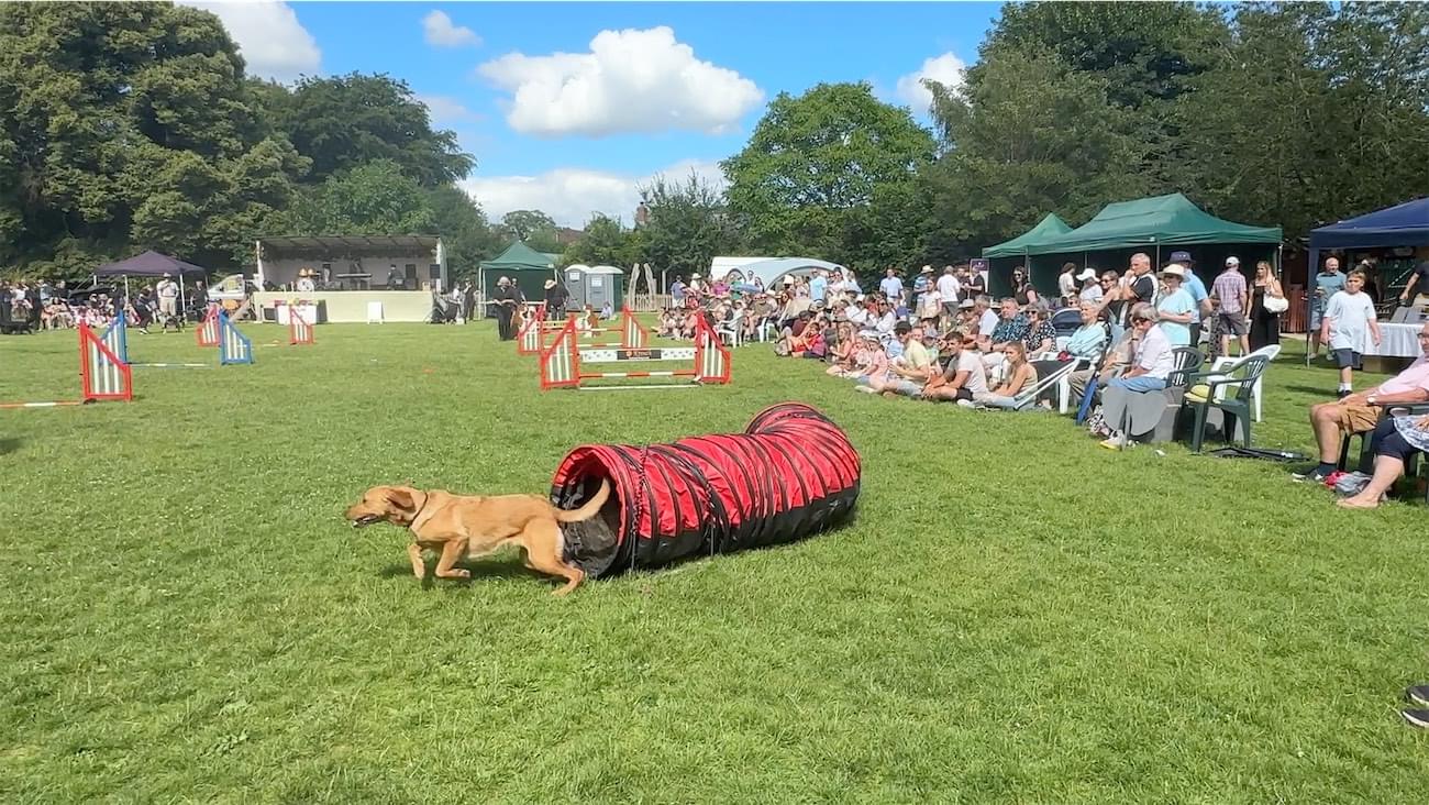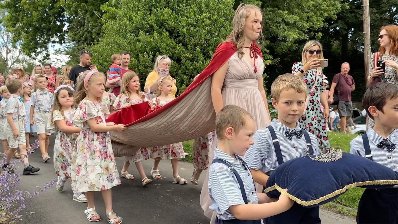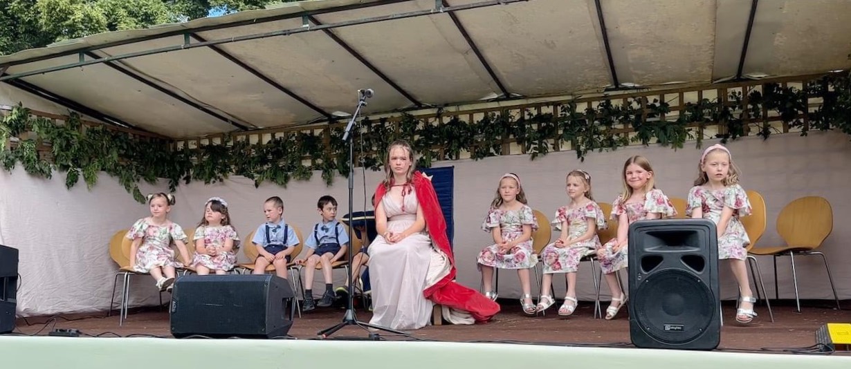 The Village Fete 2023, took place on the 24th June on the Primary School Field, the now traditional site of the Show. The theme this year was ANIMALS, and entertainment led by the Wirral Pipe Band, Paws for Thought, a dogs display team and music from Kayla and the Clockmakers. The Parade with 2023 Rose Queen Maya Joinson and her retinue gathered at Woodfields at 1.00pm and were led by the Wirral Pipe Band around the village to the Primary School field. The weather was extremely warm, and I’m sure stall holders were glad of their stalls being in the shade. By the time of the opening of the show a large gathering were sitting in an arc around the arena facing the stage.