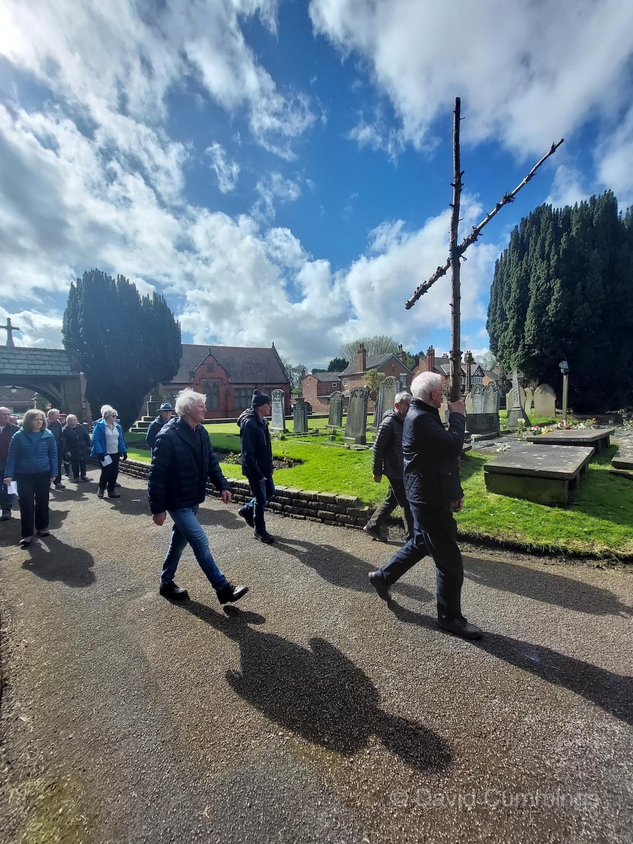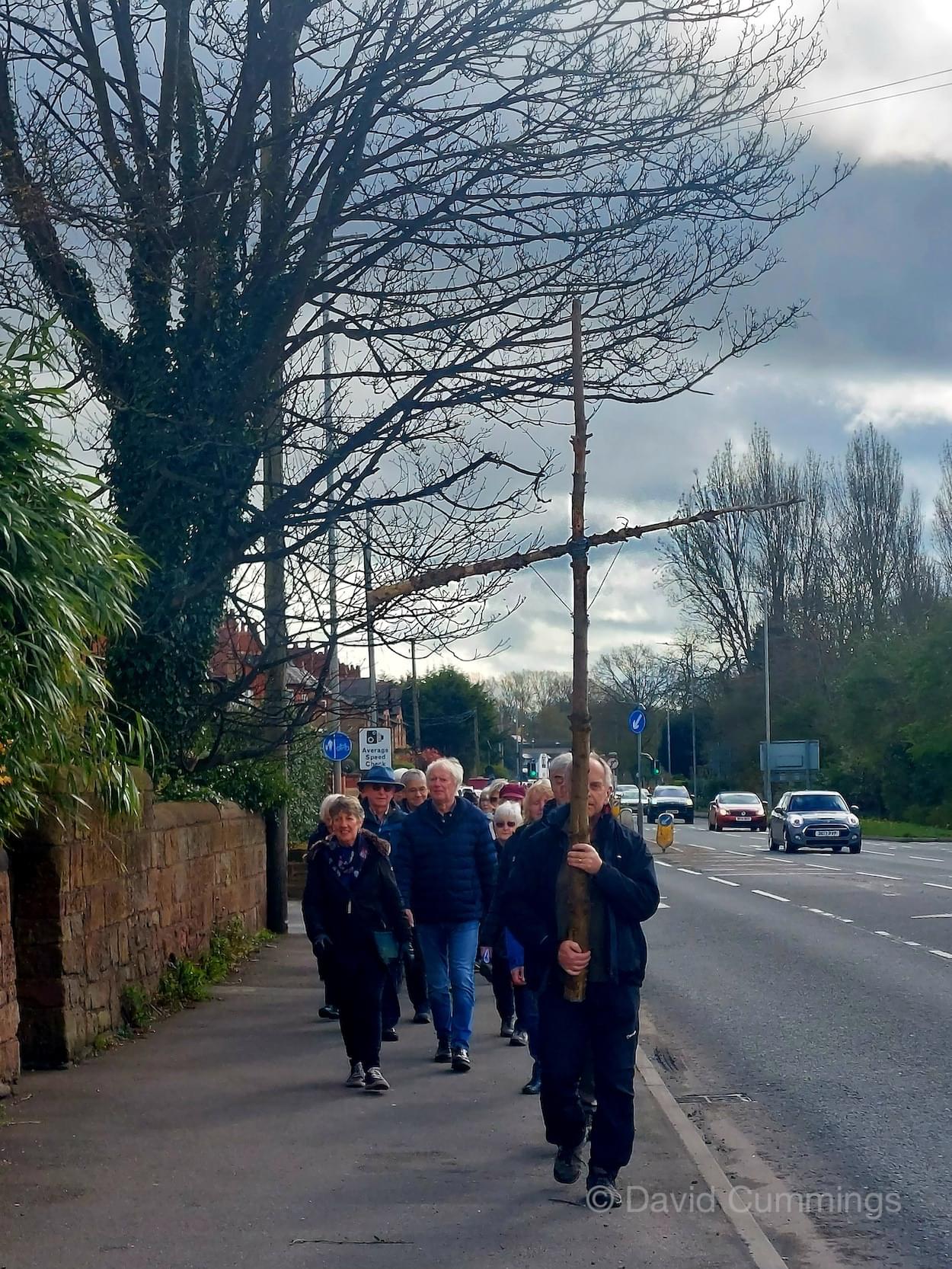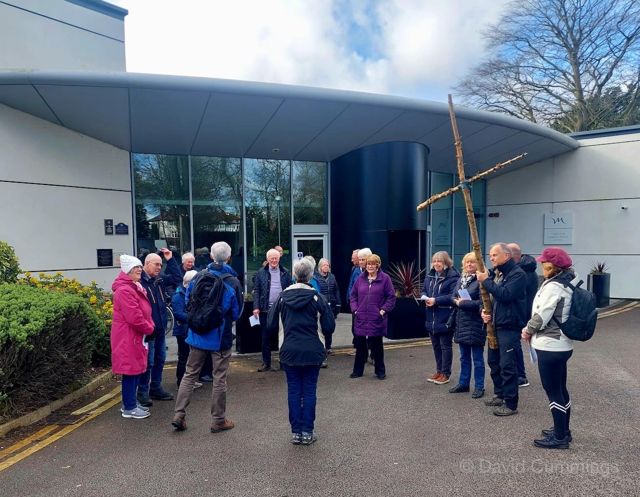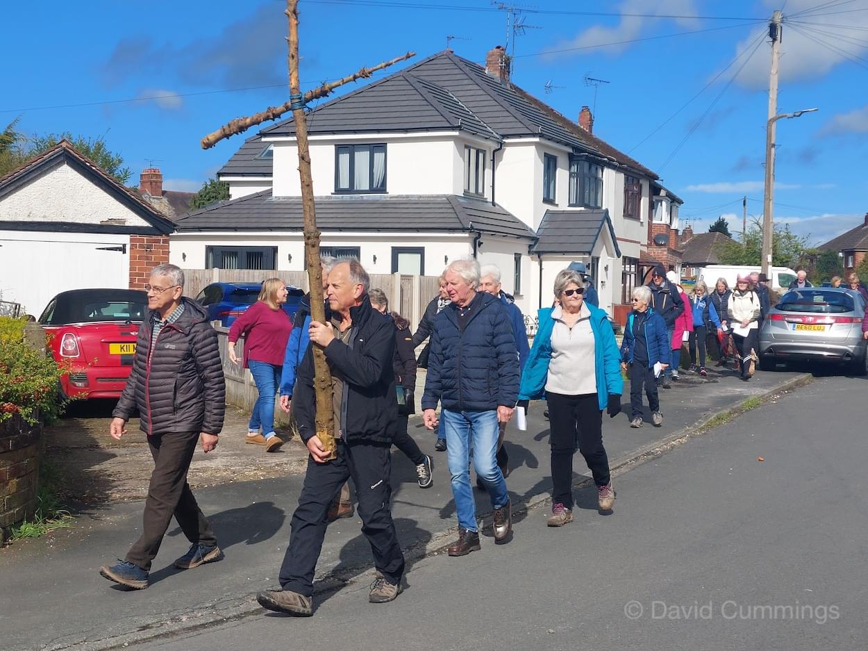 Many of the congregation from St James’ in Christleton have witnessed this event in Chester and walked from the village to take part in it. This year with no event in Chester, a Walk of Witness has taken place in Christleton. Parishioners gathered on Good Friday at the Abotts Well Hotel on Whitchurch Road for breakfast, kindly donated by the hotel, before setting off through part of the Village on their walk. The Walk started at 10.00am with prayers outside the hotel, led by the Rev. Tina Lightfoot, before setting off behind a rough hewn wooden cross towards Whitchurch Road and the Glass House. This is the point where the Christleton and Boughton parishes meet, and on the Beating of Bounds ceremony held every ten years, parishioners are led, first in prayers, and then walk through the house following the parish boundary. On this occasion the Walk of Witness participants went along the Whitchurch Road to the west and along Ring Road, to Toll Bar Road. The route taken was then along Toll Bar and Whitchurch Roads stopping for a reading and prayers near the A55 road bridge. There were 30 or so participants and after the cross was exchanged to a new leader, the walkers walked along to Quarry Bridge, where they crossed over the canal. After prayers and an exchange of cross bearer, the walkers went down Quarry Lane, passed the Primary School turning right into Hawthorn & Bush Roads. After prayers, the route continued along Hawthorn and Sandrock Roads into Quarry Lane stopping near the old Infant School, before heading up Village Road and up to the Church grounds. The group were joined by several other parishioners for a short service at the Memorial to Canon Lionel Garnett on the Church Green. Here people were invited to hammer nails into the wooden cross, as a symbol of the Crucifixion of Christ.