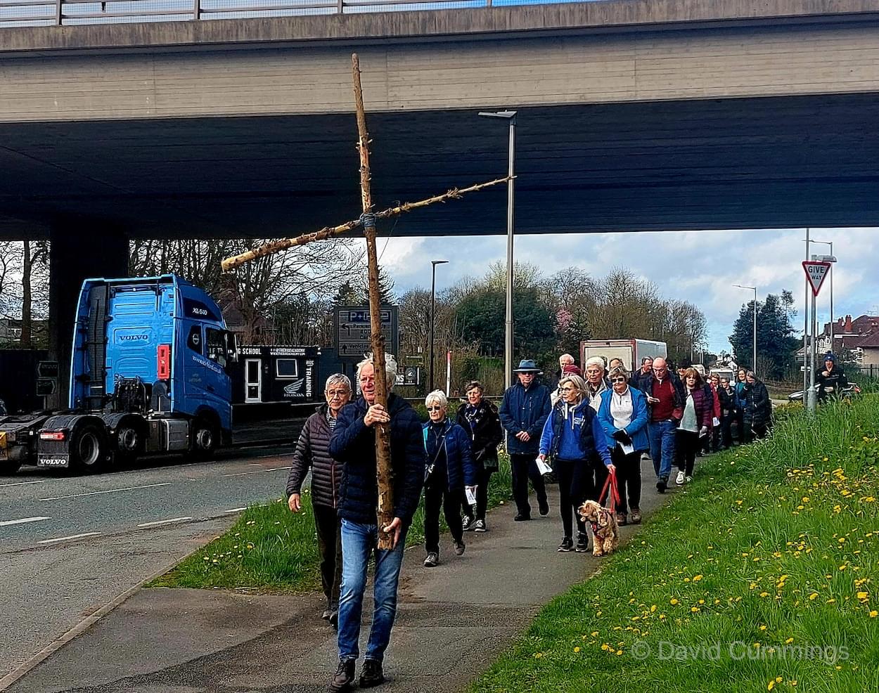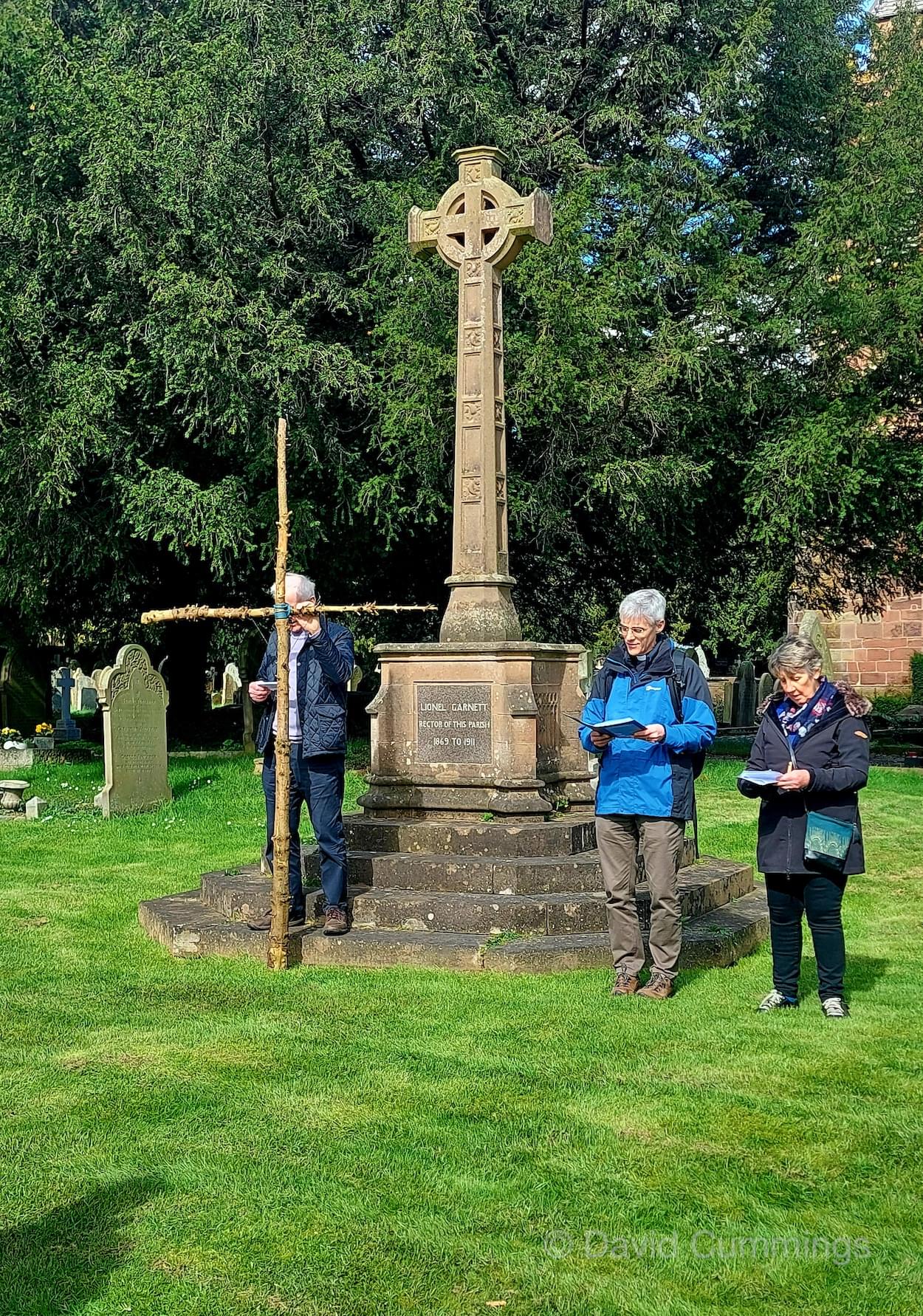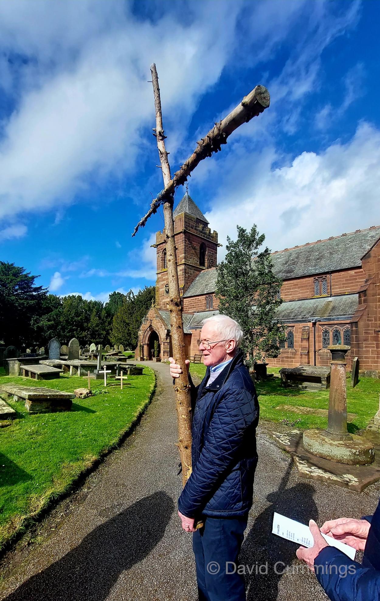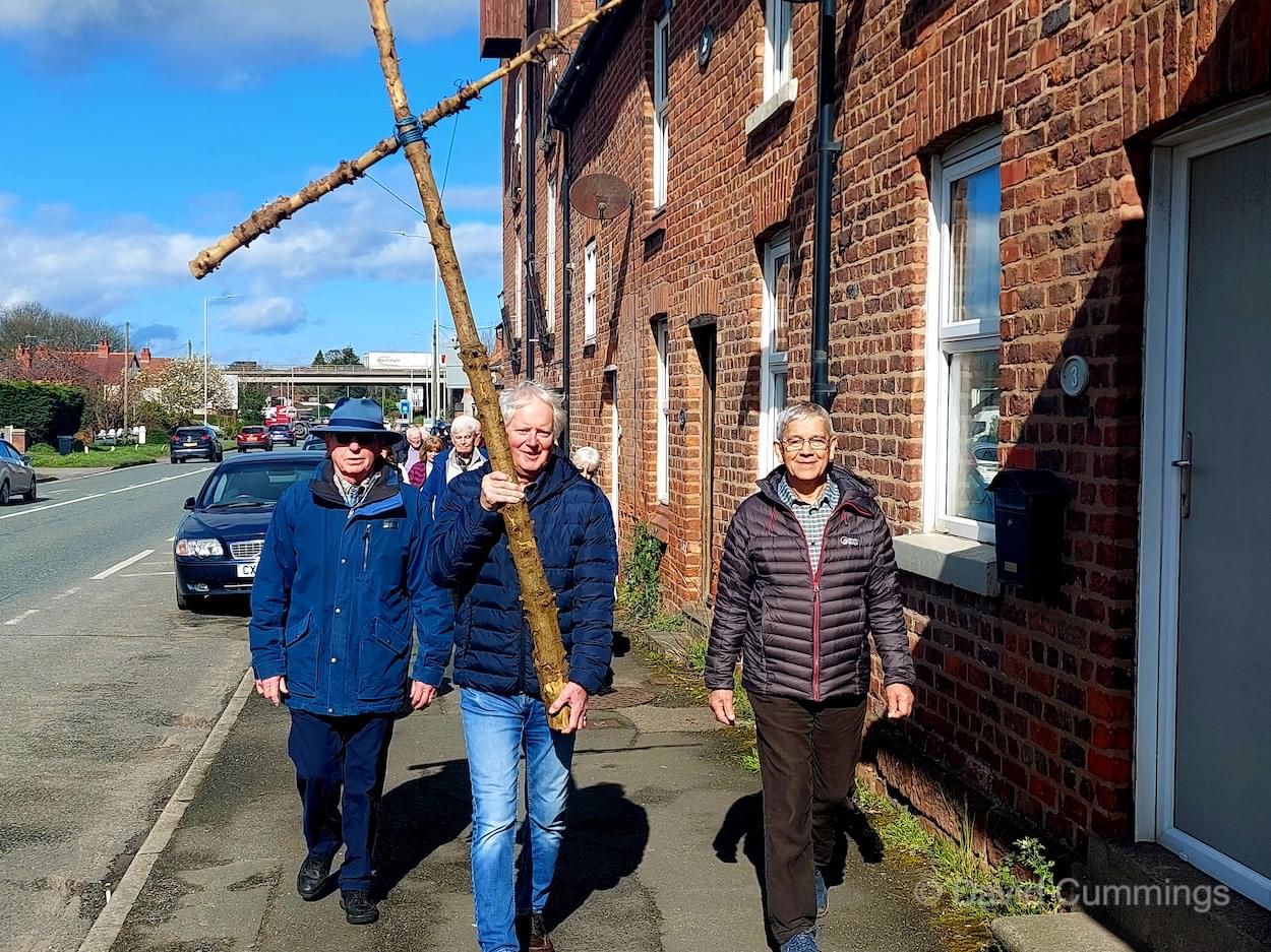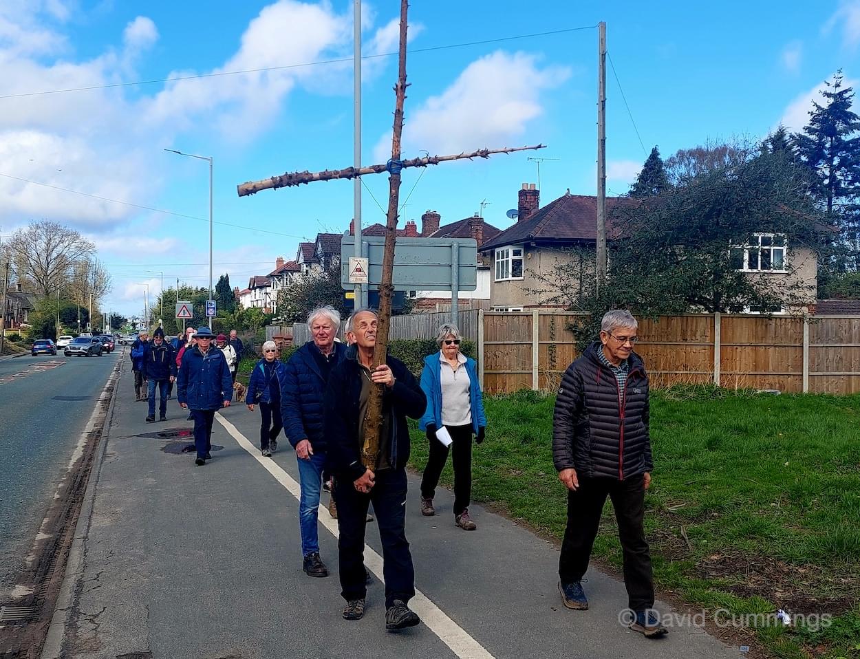 Many of the congregation from St James’ in Christleton have witnessed this event in Chester and walked from the village to take part in it. This year with no event in Chester, a Walk of Witness has taken place in Christleton. Parishioners gathered on Good Friday at the Abotts Well Hotel on Whitchurch Road for breakfast, kindly donated by the hotel, before setting off through part of the Village on their walk. The Walk started at 10.00am with prayers outside the hotel, led by the Rev. Tina Lightfoot, before setting off behind a rough hewn wooden cross towards Whitchurch Road and the Glass House. This is the point where the Christleton and Boughton parishes meet, and on the Beating of Bounds ceremony held every ten years, parishioners are led, first in prayers, and then walk through the house following the parish boundary. On this occasion the Walk of Witness participants went along the Whitchurch Road to the west and along Ring Road, to Toll Bar Road. The route taken was then along Toll Bar and Whitchurch Roads stopping for a reading and prayers near the A55 road bridge. There were 30 or so participants and after the cross was exchanged to a new leader, the walkers walked along to Quarry Bridge, where they crossed over the canal. After prayers and an exchange of cross bearer, the walkers went down Quarry Lane, passed the Primary School turning right into Hawthorn & Bush Roads. After prayers, the route continued along Hawthorn and Sandrock Roads into Quarry Lane stopping near the old Infant School, before heading up Village Road and up to the Church grounds. The group were joined by several other parishioners for a short service at the Memorial to Canon Lionel Garnett on the Church Green. Here people were invited to hammer nails into the wooden cross, as a symbol of the Crucifixion of Christ.