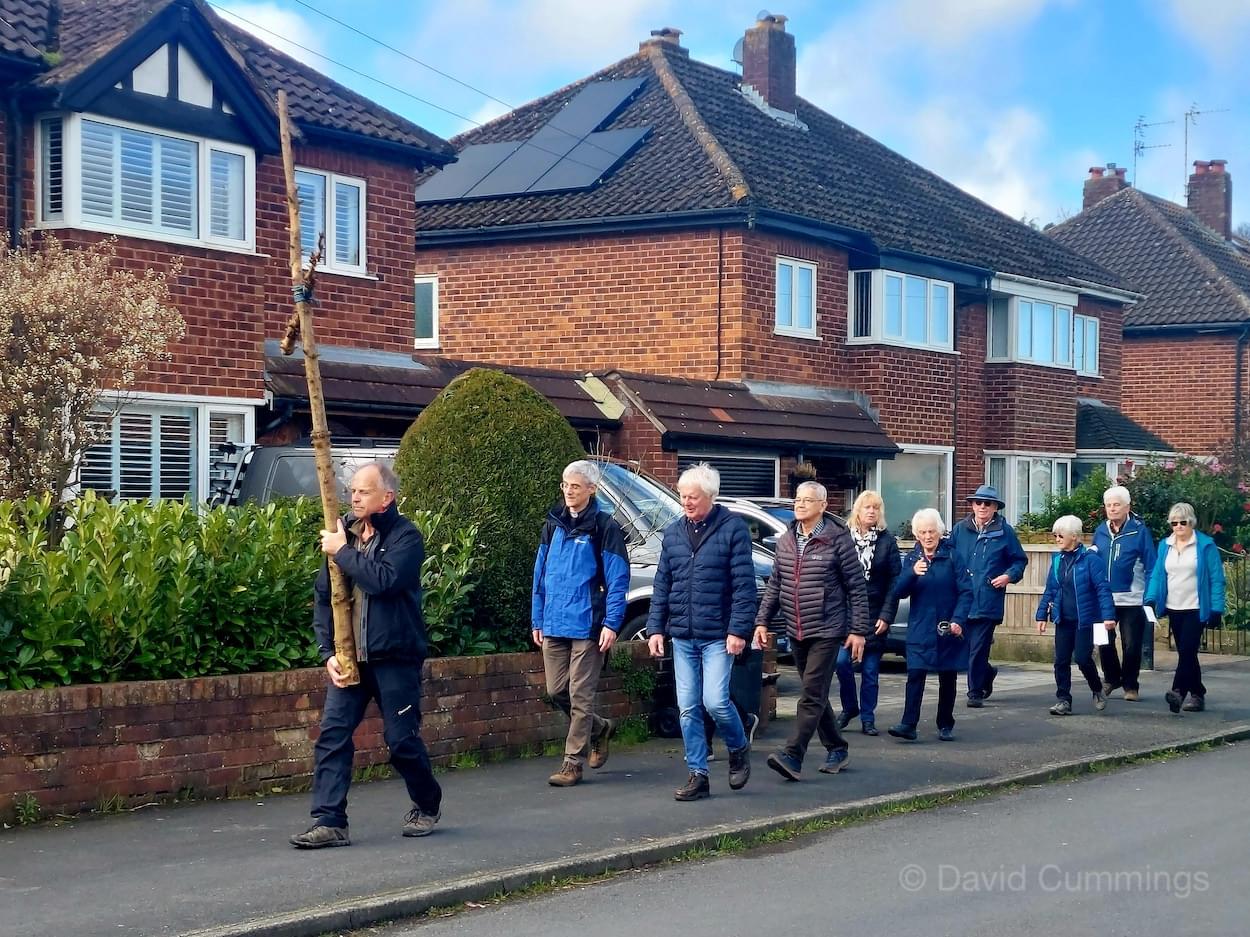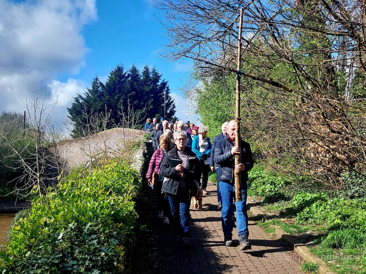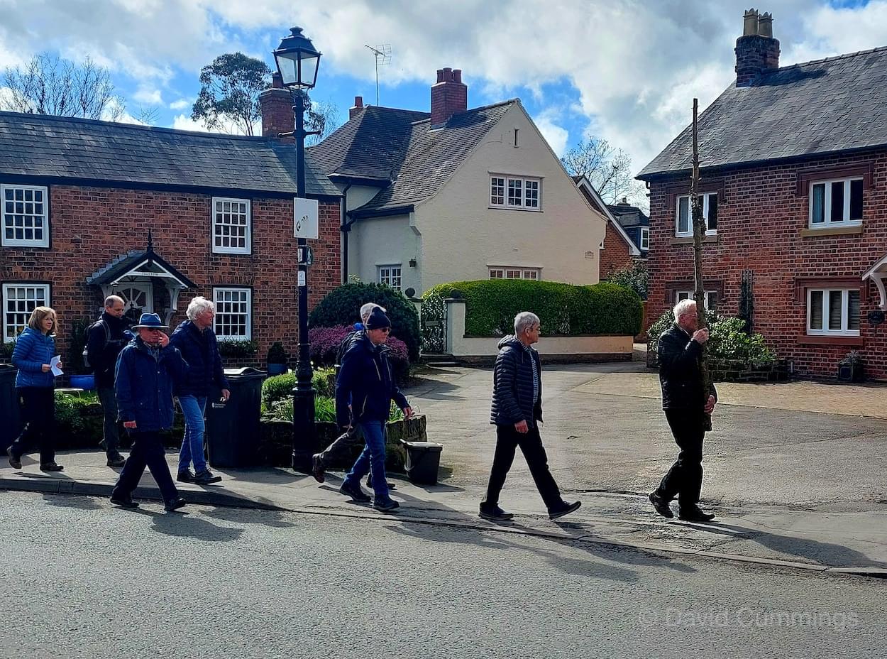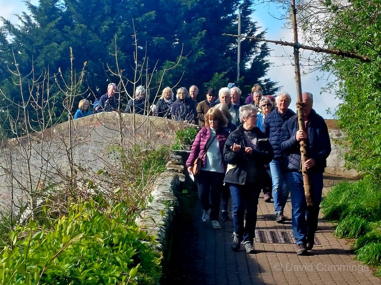 Many of the congregation from St James’ in Christleton have witnessed this event in Chester and walked from the village to take part in it. This year with no event in Chester, a Walk of Witness has taken place in Christleton. Parishioners gathered on Good Friday at the Abotts Well Hotel on Whitchurch Road for breakfast, kindly donated by the hotel, before setting off through part of the Village on their walk. The Walk started at 10.00am with prayers outside the hotel, led by the Rev. Tina Lightfoot, before setting off behind a rough hewn wooden cross towards Whitchurch Road and the Glass House. This is the point where the Christleton and Boughton parishes meet, and on the Beating of Bounds ceremony held every ten years, parishioners are led, first in prayers, and then walk through the house following the parish boundary. On this occasion the Walk of Witness participants went along the Whitchurch Road to the west and along Ring Road, to Toll Bar Road. The route taken was then along Toll Bar and Whitchurch Roads stopping for a reading and prayers near the A55 road bridge. There were 30 or so participants and after the cross was exchanged to a new leader, the walkers walked along to Quarry Bridge, where they crossed over the canal. After prayers and an exchange of cross bearer, the walkers went down Quarry Lane, passed the Primary School turning right into Hawthorn & Bush Roads. After prayers, the route continued along Hawthorn and Sandrock Roads into Quarry Lane stopping near the old Infant School, before heading up Village Road and up to the Church grounds. The group were joined by several other parishioners for a short service at the Memorial to Canon Lionel Garnett on the Church Green. Here people were invited to hammer nails into the wooden cross, as a symbol of the Crucifixion of Christ.