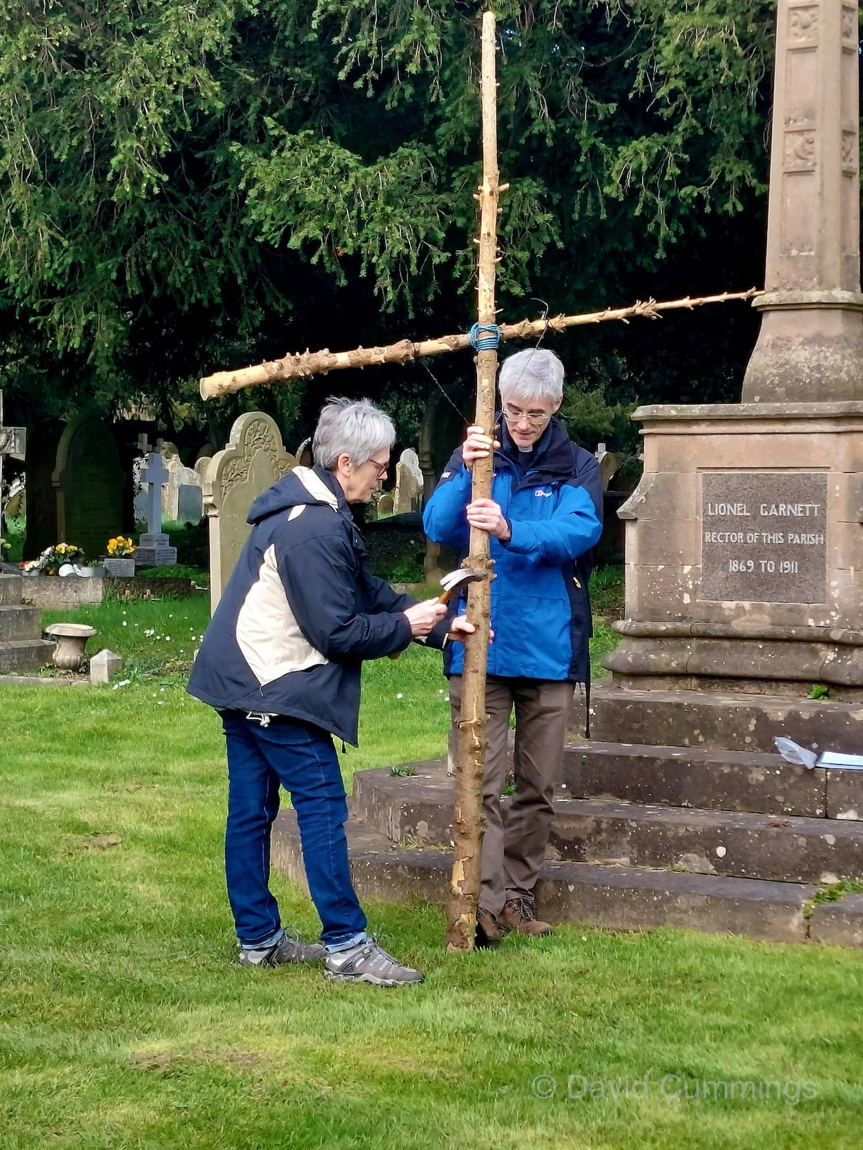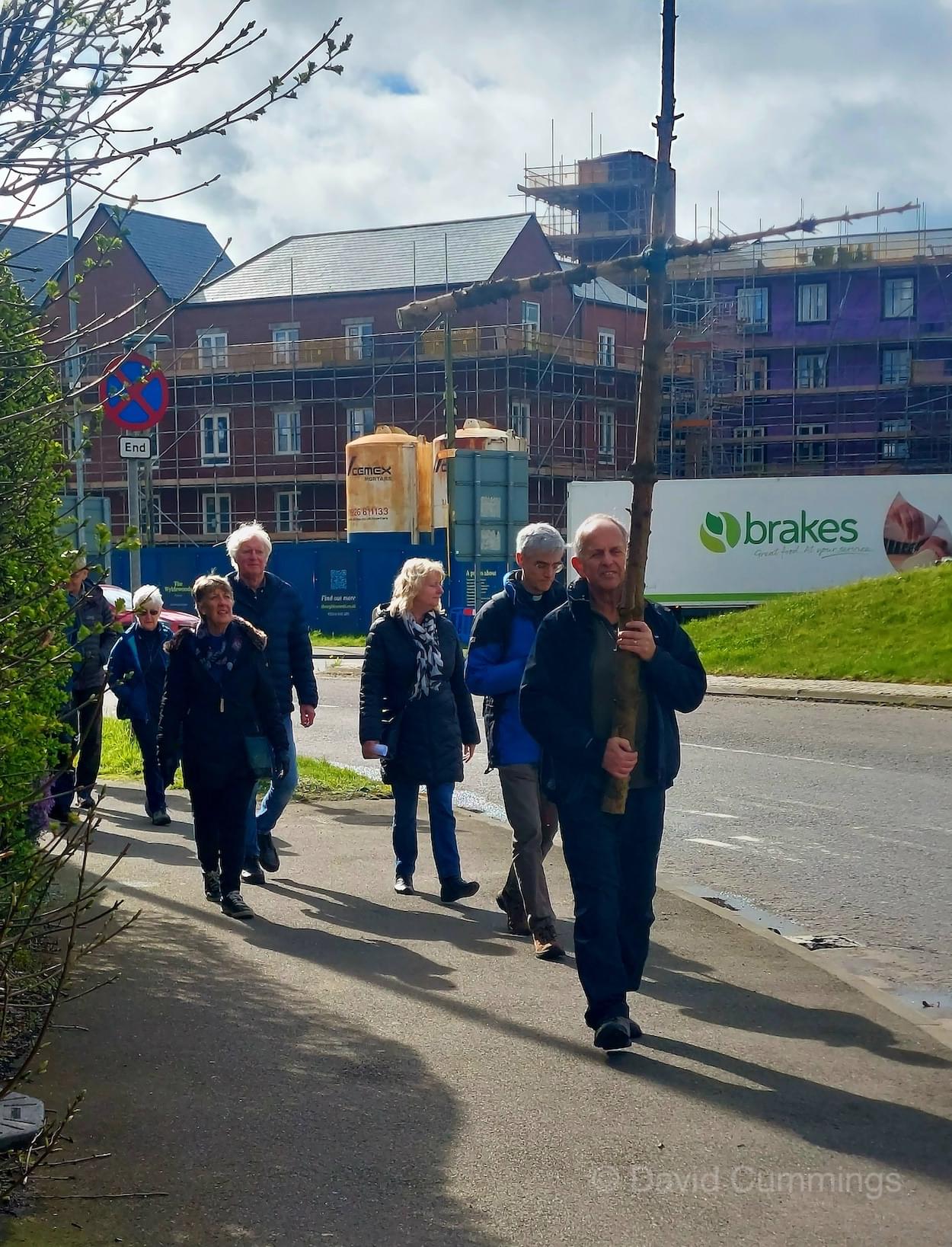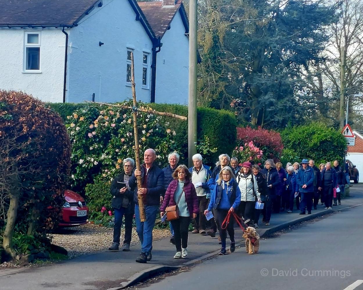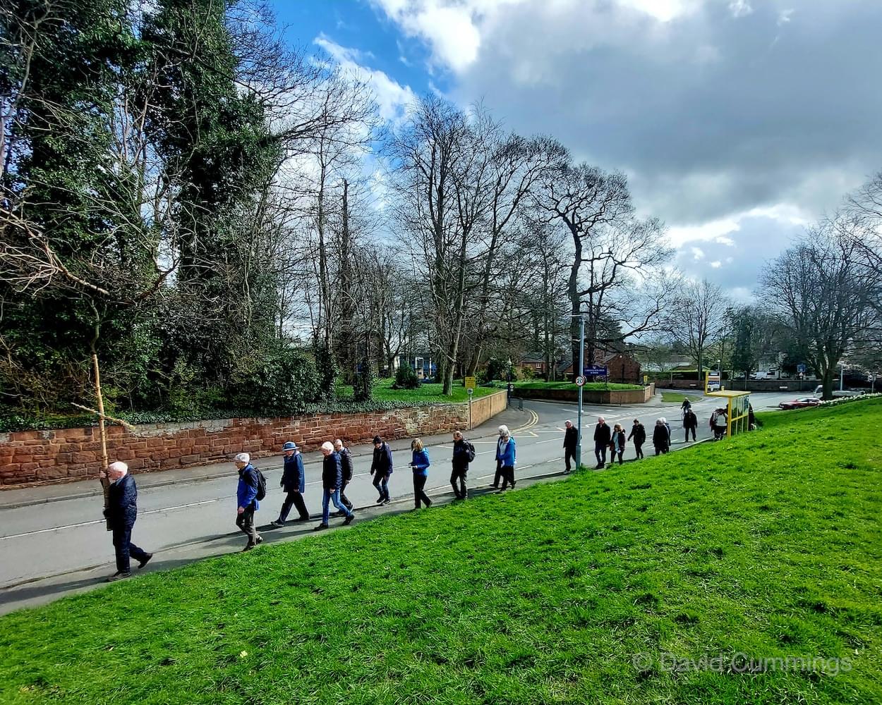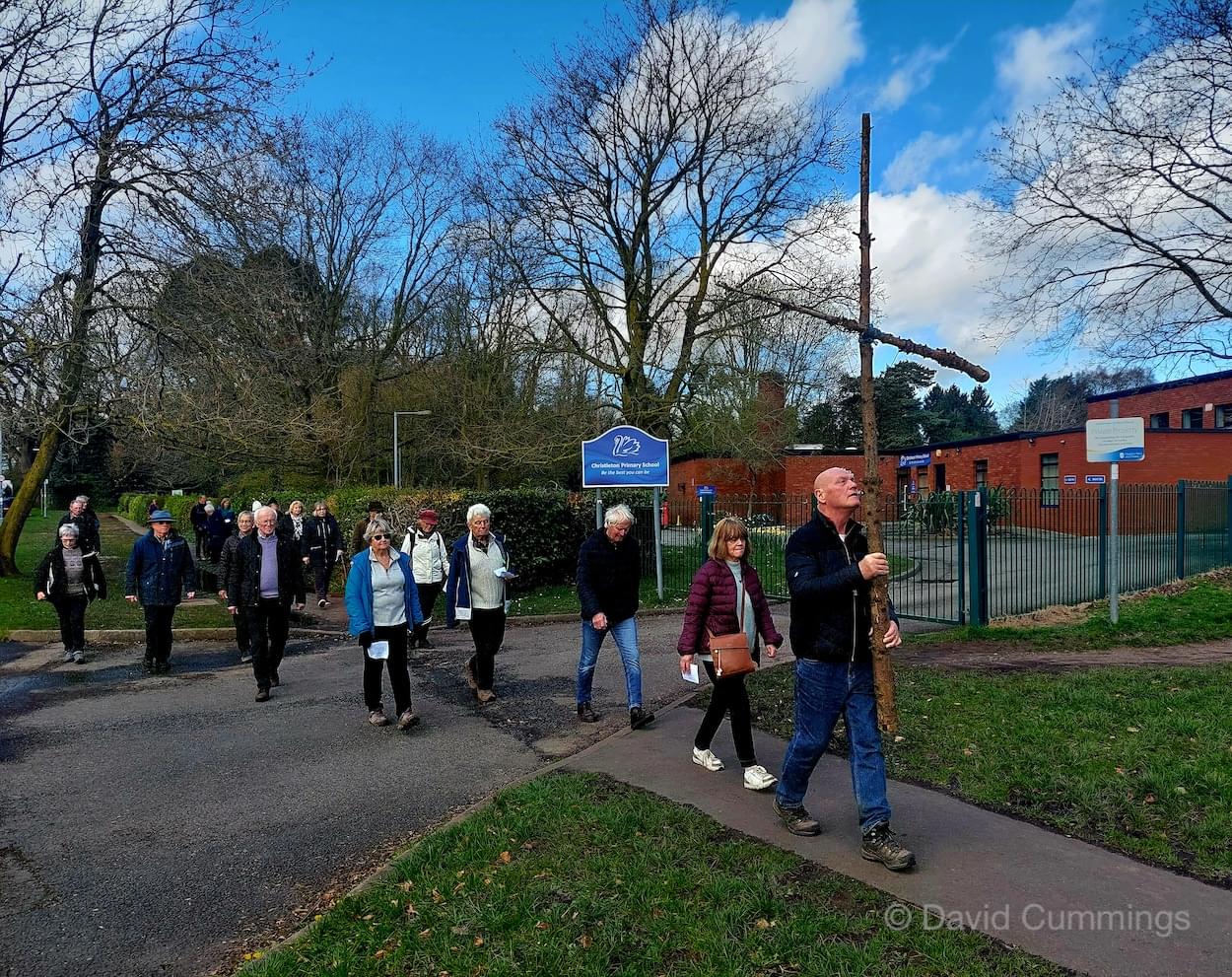 Many of the congregation from St James’ in Christleton have witnessed this event in Chester and walked from the village to take part in it. This year with no event in Chester, a Walk of Witness has taken place in Christleton. Parishioners gathered on Good Friday at the Abotts Well Hotel on Whitchurch Road for breakfast, kindly donated by the hotel, before setting off through part of the Village on their walk. The Walk started at 10.00am with prayers outside the hotel, led by the Rev. Tina Lightfoot, before setting off behind a rough hewn wooden cross towards Whitchurch Road and the Glass House. This is the point where the Christleton and Boughton parishes meet, and on the Beating of Bounds ceremony held every ten years, parishioners are led, first in prayers, and then walk through the house following the parish boundary. On this occasion the Walk of Witness participants went along the Whitchurch Road to the west and along Ring Road, to Toll Bar Road. The route taken was then along Toll Bar and Whitchurch Roads stopping for a reading and prayers near the A55 road bridge. There were 30 or so participants and after the cross was exchanged to a new leader, the walkers walked along to Quarry Bridge, where they crossed over the canal. After prayers and an exchange of cross bearer, the walkers went down Quarry Lane, passed the Primary School turning right into Hawthorn & Bush Roads. After prayers, the route continued along Hawthorn and Sandrock Roads into Quarry Lane stopping near the old Infant School, before heading up Village Road and up to the Church grounds. The group were joined by several other parishioners for a short service at the Memorial to Canon Lionel Garnett on the Church Green. Here people were invited to hammer nails into the wooden cross, as a symbol of the Crucifixion of Christ.