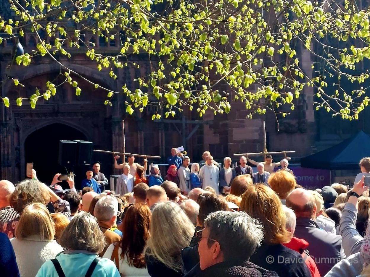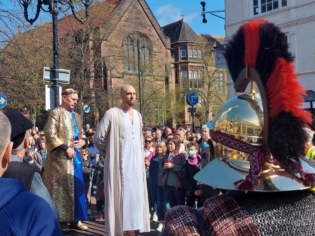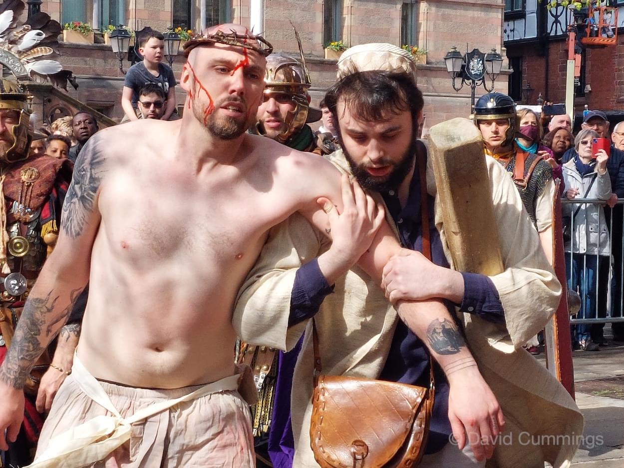 During the last decade, a Walk of Witness has taken place in several forms in and around the City. Beryl and I and many friends have taken part in the Good Friday procession in the city, promoted by the churches of the area in conjunction with the Cathedral Team and the Chester Mystery Play. Here a large cast of actors and singers tell the Easter story from the Eastgate, along Eastgate Street to the cross, turning up into Northgate Street to the Town Hall Square and then into St Werburgh Street and the Cathedral Square. This procession is a very graphic depiction of the events that took place in Jerusalem all those years ago, and the story is followed by an estimated 4,000 Cestrians & visitors. It is a memorable event in the City calendar which takes place usually in the years when there are no Mystery Plays.