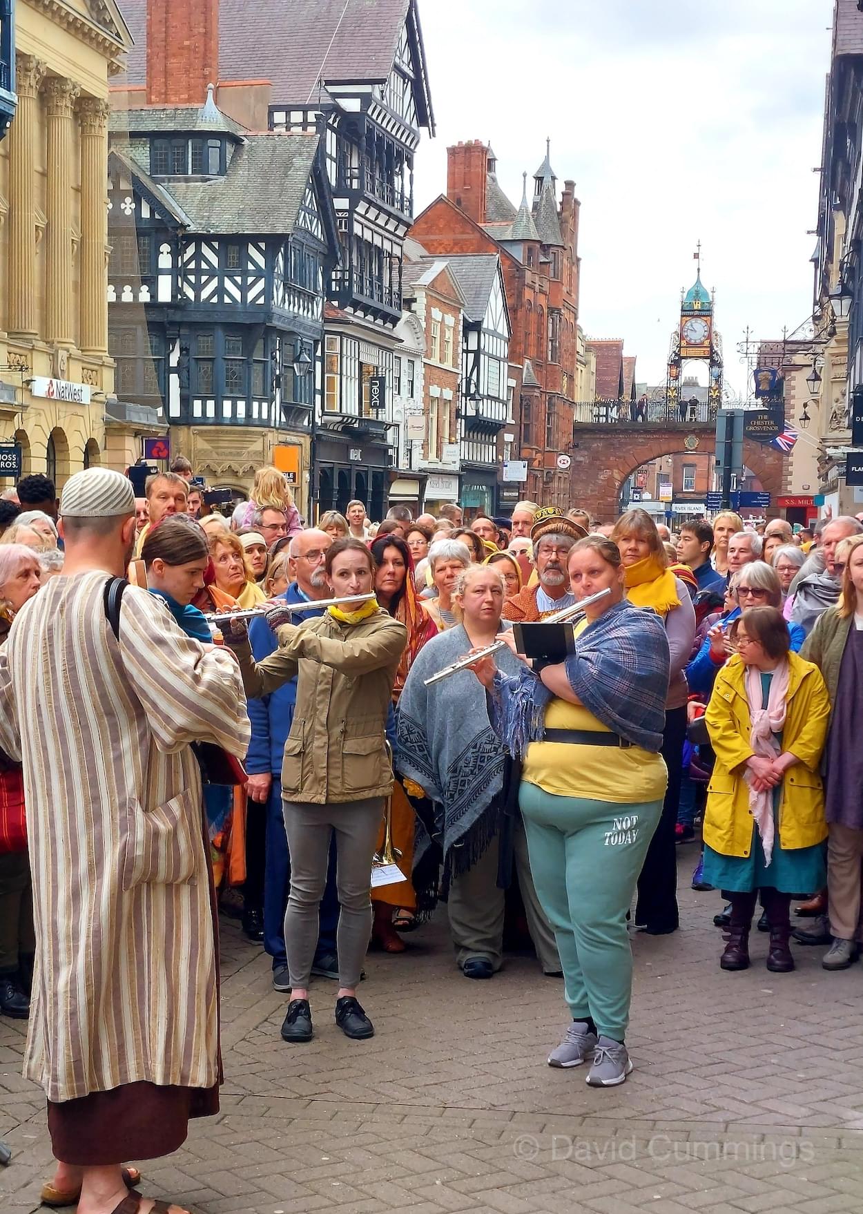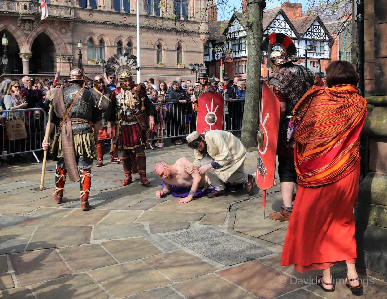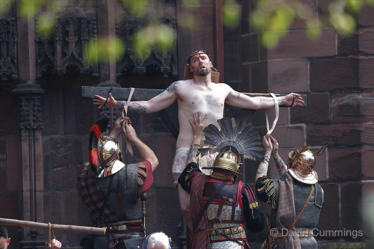 During the last decade, a Walk of Witness has taken place in several forms in and around the City. Beryl and I and many friends have taken part in the Good Friday procession in the city, promoted by the churches of the area in conjunction with the Cathedral Team and the Chester Mystery Play. Here a large cast of actors and singers tell the Easter story from the Eastgate, along Eastgate Street to the cross, turning up into Northgate Street to the Town Hall Square and then into St Werburgh Street and the Cathedral Square. This procession is a very graphic depiction of the events that took place in Jerusalem all those years ago, and the story is followed by an estimated 4,000 Cestrians & visitors. It is a memorable event in the City calendar which takes place usually in the years when there are no Mystery Plays.