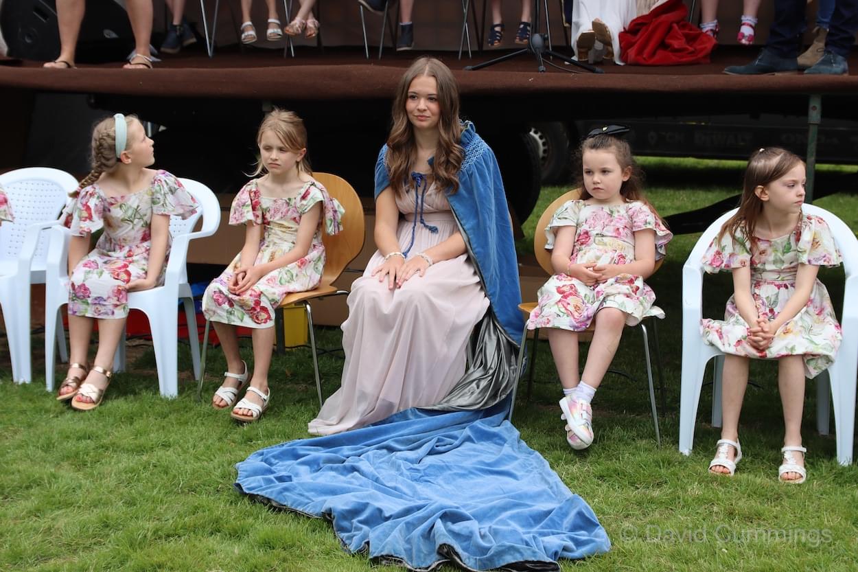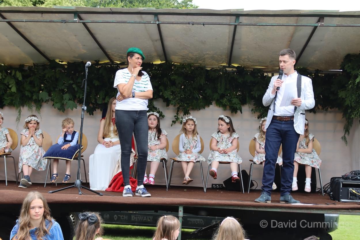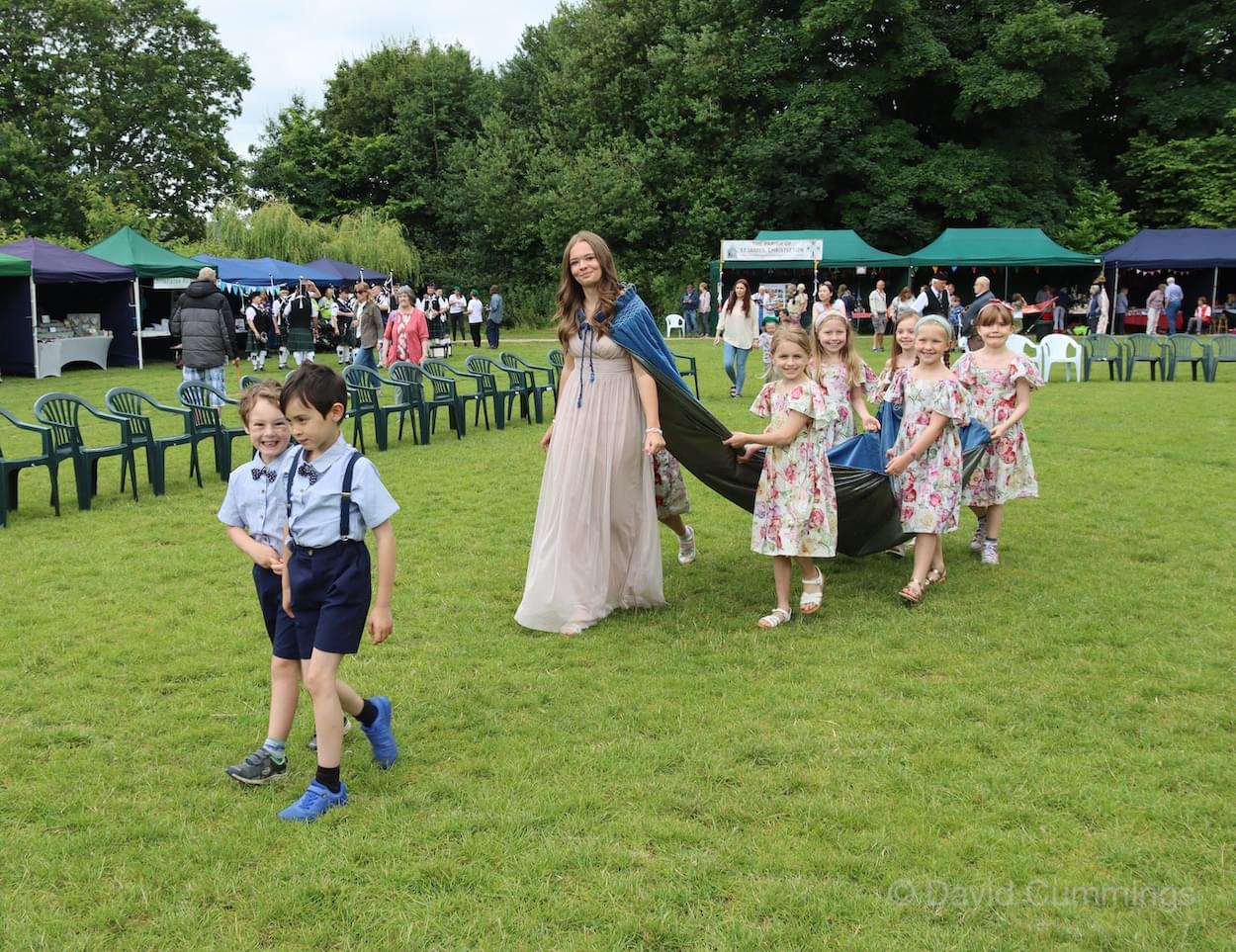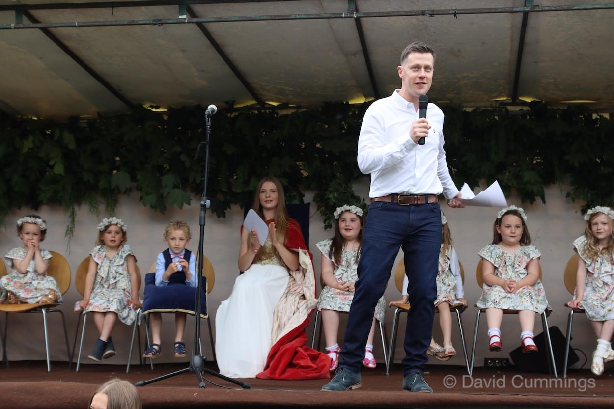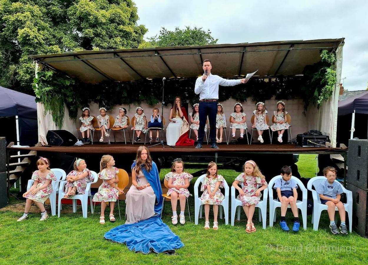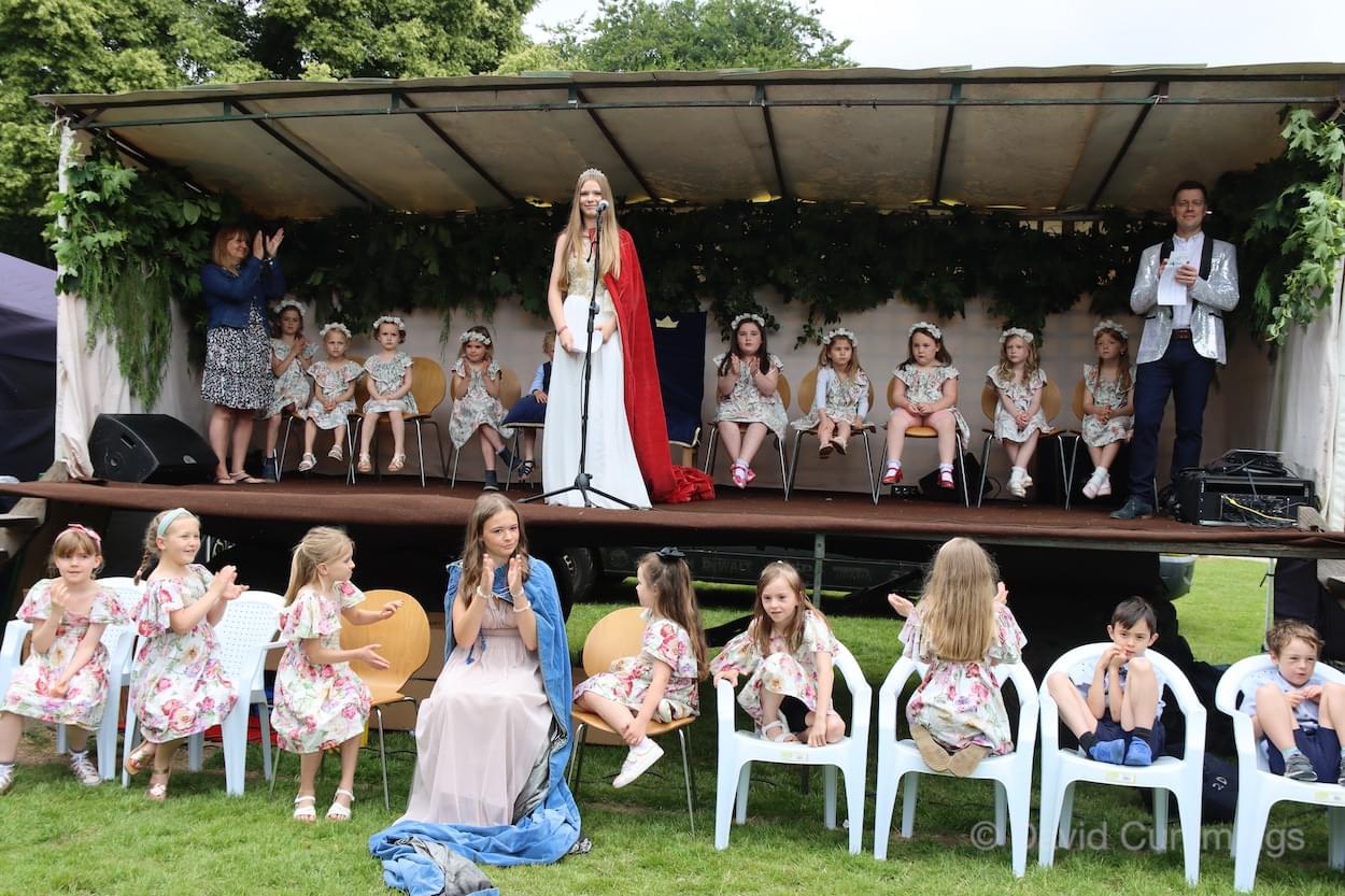 The Rose Queen Bella Thompson Pollock was accompanied by Albie Potter (Page Boy) and a retinue of Athena & Helena Cosstick, Harriet Stead, Hattie Banks, Sophie Stevenson, Florence Georgia Williams, Darcy Cannock Edwards and Nia and Ivy Lewis. The Retiring Rose Queen, Maya Joinson and her retinue were also in the procession. Parents once again contributed to the Fete, with the children looking bright and cheerful in their summery dresses. The Compere this year was Jon Cannock-Edwards who enthusiastically introduced proceedings, and welcomed the Guest of Honour Dawn Sturgess, who has been responsible for organising the fete for over the last ten years. She fully deserves the accolades given to her as she has been the driving force behind all these events. Dawn accepted the applause of the audience, and thanked everyone for supporting her, but also putting out a plea for more people to join the organising committee.