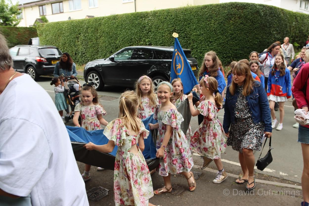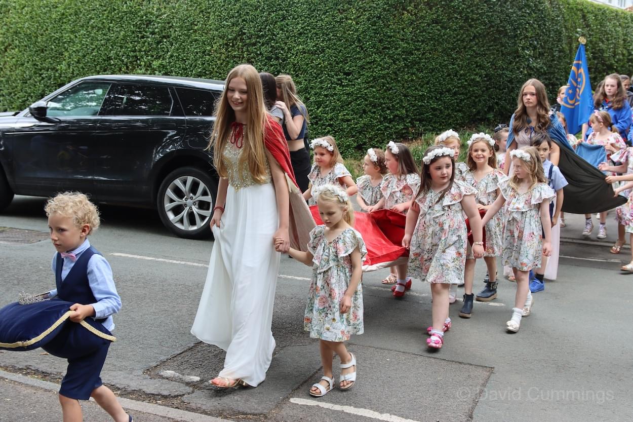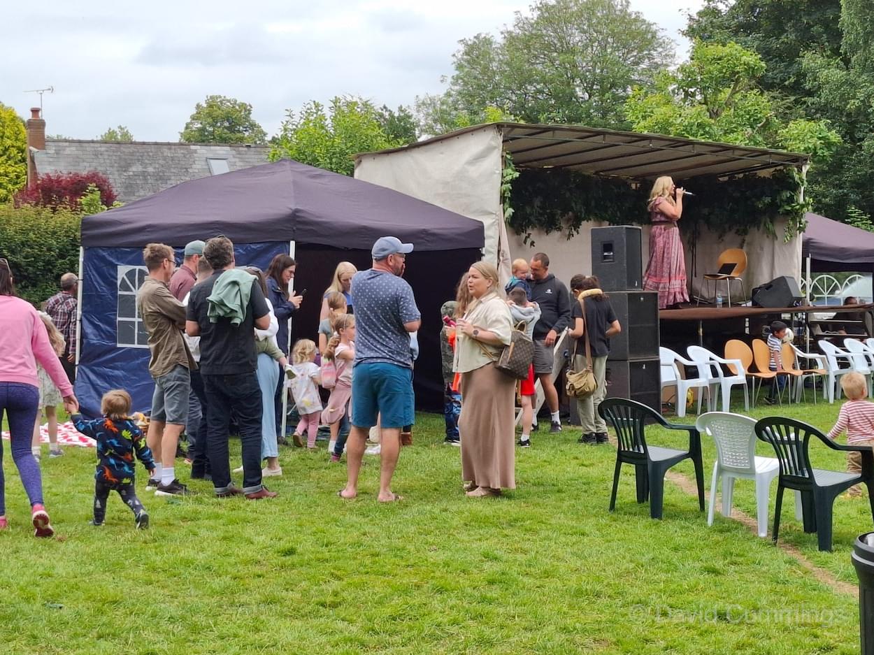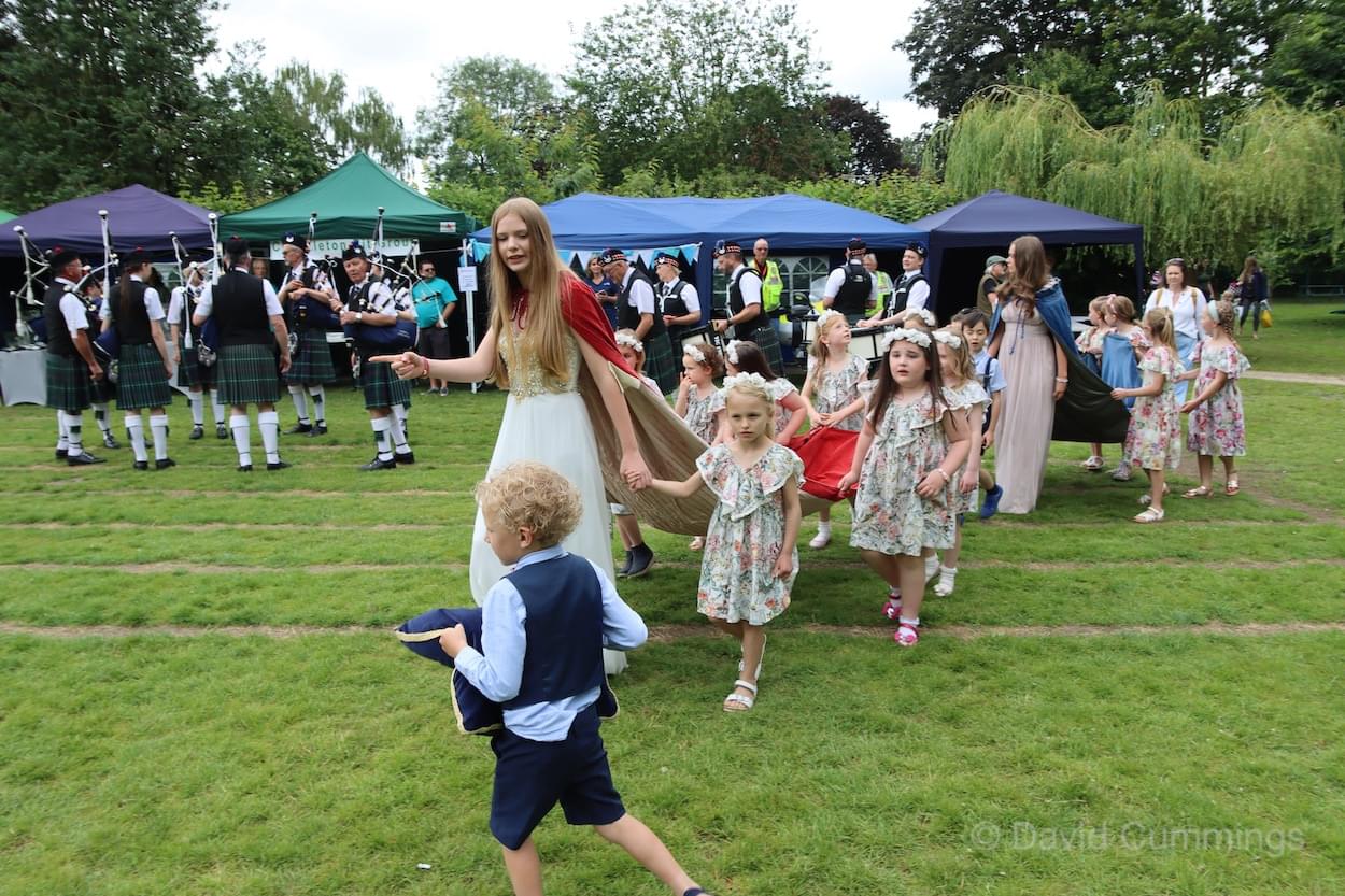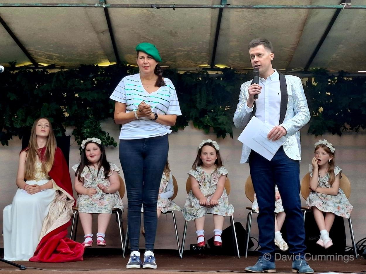The Rose Queen Bella Thompson Pollock was accompanied by Albie Potter (Page Boy) and a retinue of Athena & Helena Cosstick, Harriet Stead, Hattie Banks, Sophie Stevenson, Florence Georgia Williams, Darcy Cannock Edwards and Nia and Ivy Lewis. The Retiring Rose Queen, Maya Joinson and her retinue were also in the procession. Parents once again contributed to the Fete, with the children looking bright and cheerful in their summery dresses. The Compere this year was Jon Cannock-Edwards who enthusiastically introduced proceedings, and welcomed the Guest of Honour Dawn Sturgess, who has been responsible for organising the fete for over the last ten years. She fully deserves the accolades given to her as she has been the driving force behind all these events. Dawn accepted the applause of the audience, and thanked everyone for supporting her, but also putting out a plea for more people to join the organising committee.