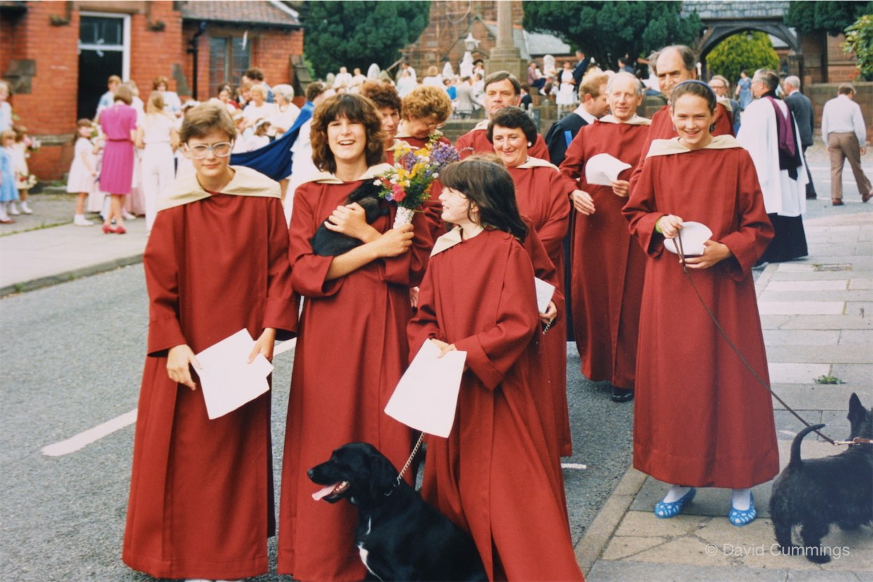 Personalites of 1987, included Headteacher Phil Hodges seen standing outside the High School, Frank Poston, Captain of the Bellringers, Gertrude Wright and her work with Tibetan refugee children in Leh Ladakh, Mabel Kirk from Kirk’s Nurseries in Littleton, Cliff Boddy Chorister and Verger at St James, Gerald Goodyer, Sacristan and Sunday School Teacher, Ted Griffiths, a great plantsman who produced varieties of flowering plants for Wisley, the National Horticultural Garden Headquarters in Surrey. Also featured are Jim & Lucy Partington. Within the Village, events such as the Church Tower being under scaffold, having urgent repairs, a trench for a new Gas pipeline was being dug through the village, and a new telephone system was being fitted into the Village Telephone Box. Butlers Mill had closed by this time and had been converted to living accommodation, but narrow boats always seemed to be moored alongside. Dean’s Marina and ancillary workshops were still in operation around Rowton Bridge, with boats and pleasure cruisers being serviced. The Fete and Fun run will be dealt with in future articles, but the Fun Run featured was very popular as there was a French Exchange taking place at that time and almost 600 people took part that year, a race starting from the Ring O Bells. I’ve included images of the Harvest Service that year, a very popular event in the church & school calendar, together with the Flower and Pet Service held in July.
