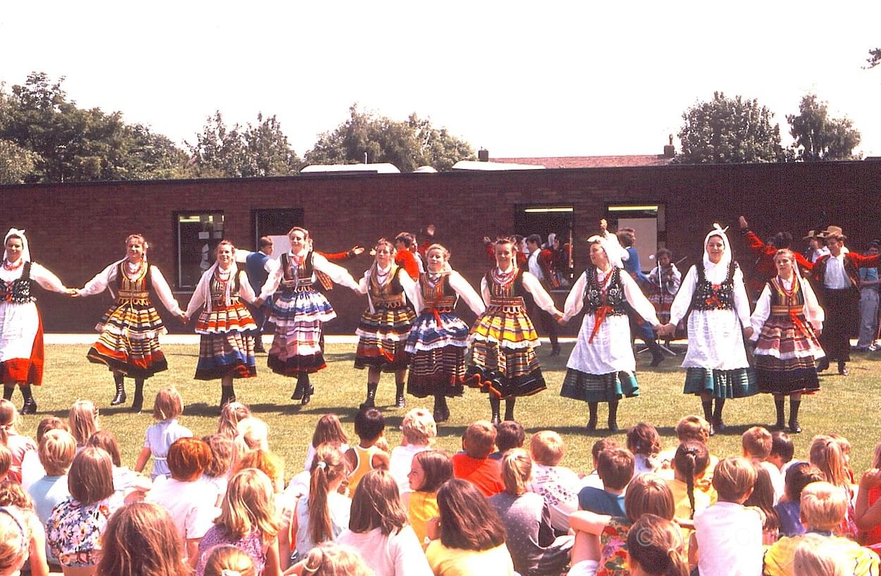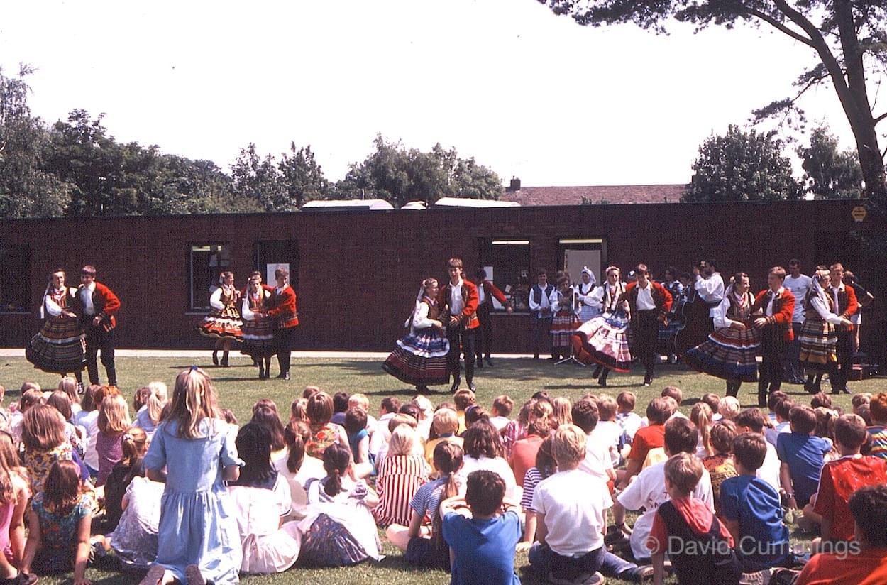 Whilst searching for suitable images to illustrate this article I came across a large number of old colour slides of colourful Dance Groups performing in the school grounds. In this case, groups from across Europe taking part in the Chester Folk Dance Festival, often coinciding with the Llangollen International Festival, in which the school hosted Folk Dance Groups brought to Chester at the invitation of the Chester Folk Dance Ensemble. Groups from Poland, Czechoslovakia, and Sweden are illustrated in these pictures. The School Maypole team would usually perform their series of traditional English Maypole Dances, before a picnic lunch. This was followed by colourful displays of dances in the tradition of the visiting dance groups. On one amazing occasion, the Swedish group took hold of children from every class, and we danced a conga all across the school playground, and by clever team work, the dance evolved into lines of dancers across the playground. The Swedish team were wonderful ambassadors of their country, and wanted to know more about our delightful village. We took them to the Pit, St James Church, and all through the village during their stay. Christleton already had links to Sweden though Leon and Lallah Boucher who lived in the Park. Leon, then a Director of Students at Chester College, regularly placed students at Christleton Primary School for a short teaching practice or observation.