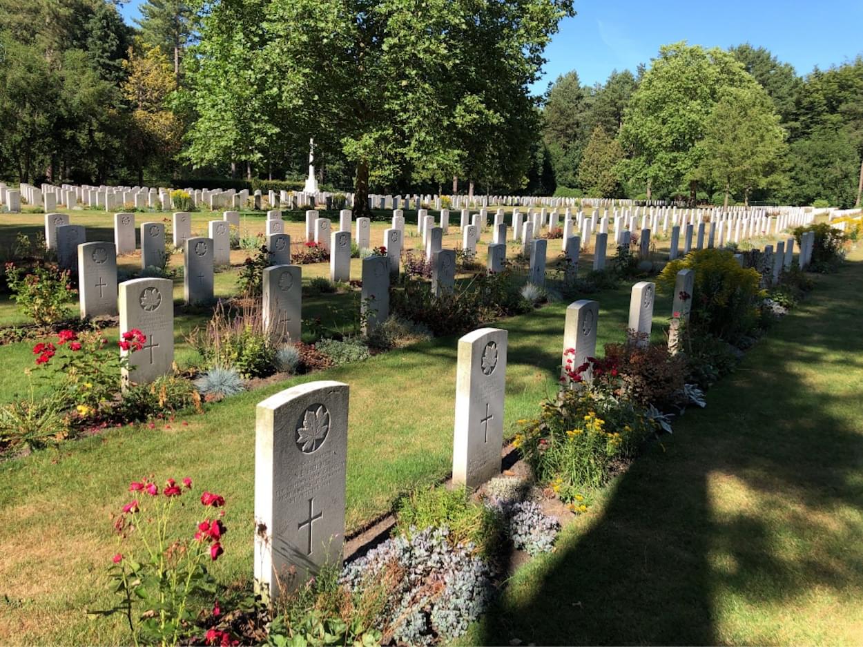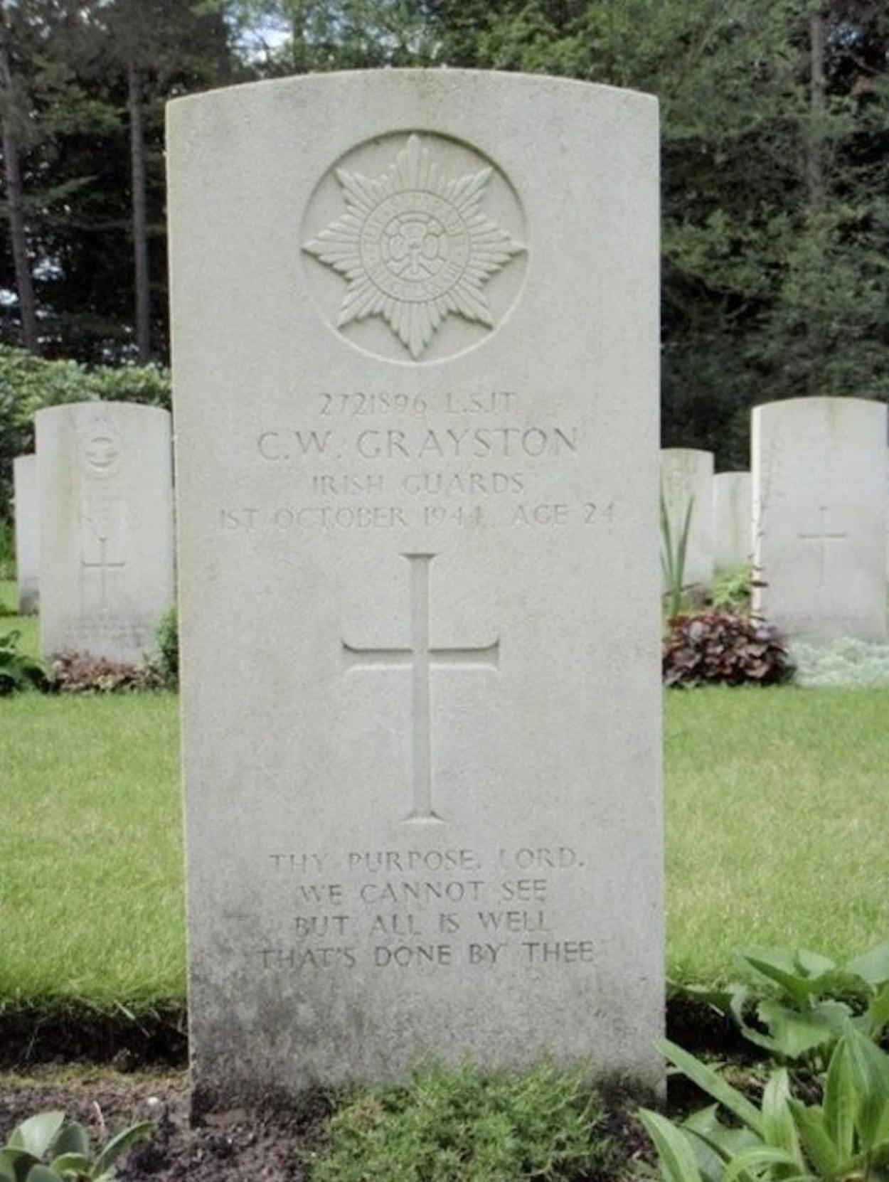 October 1st AAM - To the left of the 7th Green Howards, the 3rd Battalion Irish Guards was also struck by the German counterattack on the morning of October 1st. The Irish Guards had taken up position at Aam - a hamlet, described by the Irish Guards history as "an undistinguished and uninviting group of farms and brick houses on a rough road two miles to the east of the main road to Arnhem". The battalion had exchanged positions with the 1st Battalion Welsh Guards on 28th September. The companies occupied positions on and around the high embankment of an unfinished motorway which was to connect Arnhem with Nijmegen (the green line on the map). The position was backed up by the tanks of No. 2 Squadron, 2nd Battalion Irish Guards. By the evening of October 1st, as with the Green Howards at Heuvel, the German counterattack had been repulsed with heavy loss for the attacker. It can be assumed that because Lance Sergeant Christopher Walker Grayson is buried at Bergen–Op-Zoom War Cemetery (approx.. 140 kilometres from Aam), and his fellow soldiers who died on 1st October 1944 are all buried in various War Cemeteries around Arnhem, which are close to Aam, he was probably injured towards the end of September and was being transported back home for treatment, he must have eventually died of his wounds.