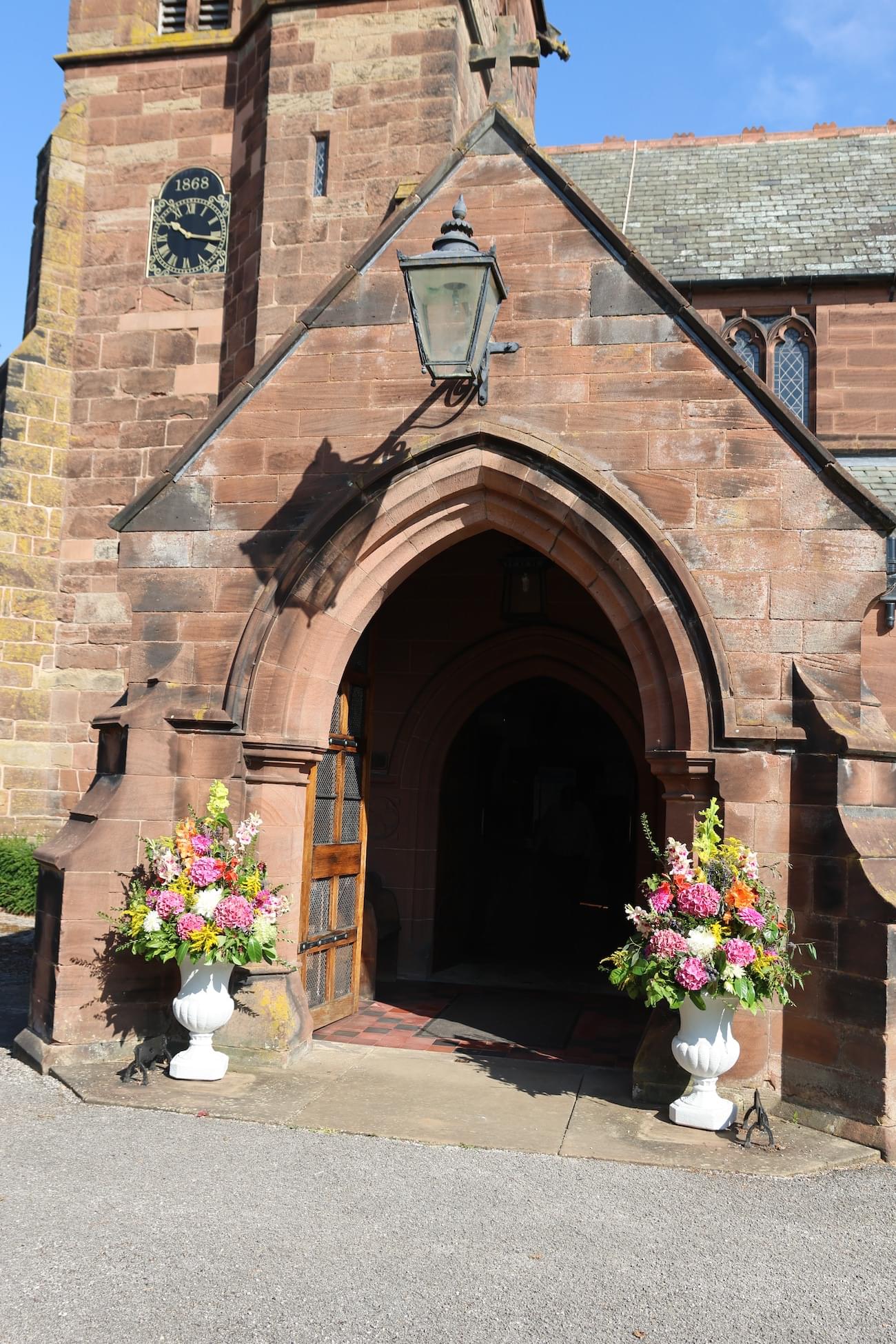 Two weeks ago, a marriage took place at St James at St James’ between Thomas Harding and Sian Leake. The Church was filled with beautiful wild flower arrangements, created by Diane Lloyd, who grows flowers in a field near Tarporley. Her work is outstanding, and you can see two of her arrangements, outside the church porch. The displays were a wonderful example of locally grown cut flowers and foliage.